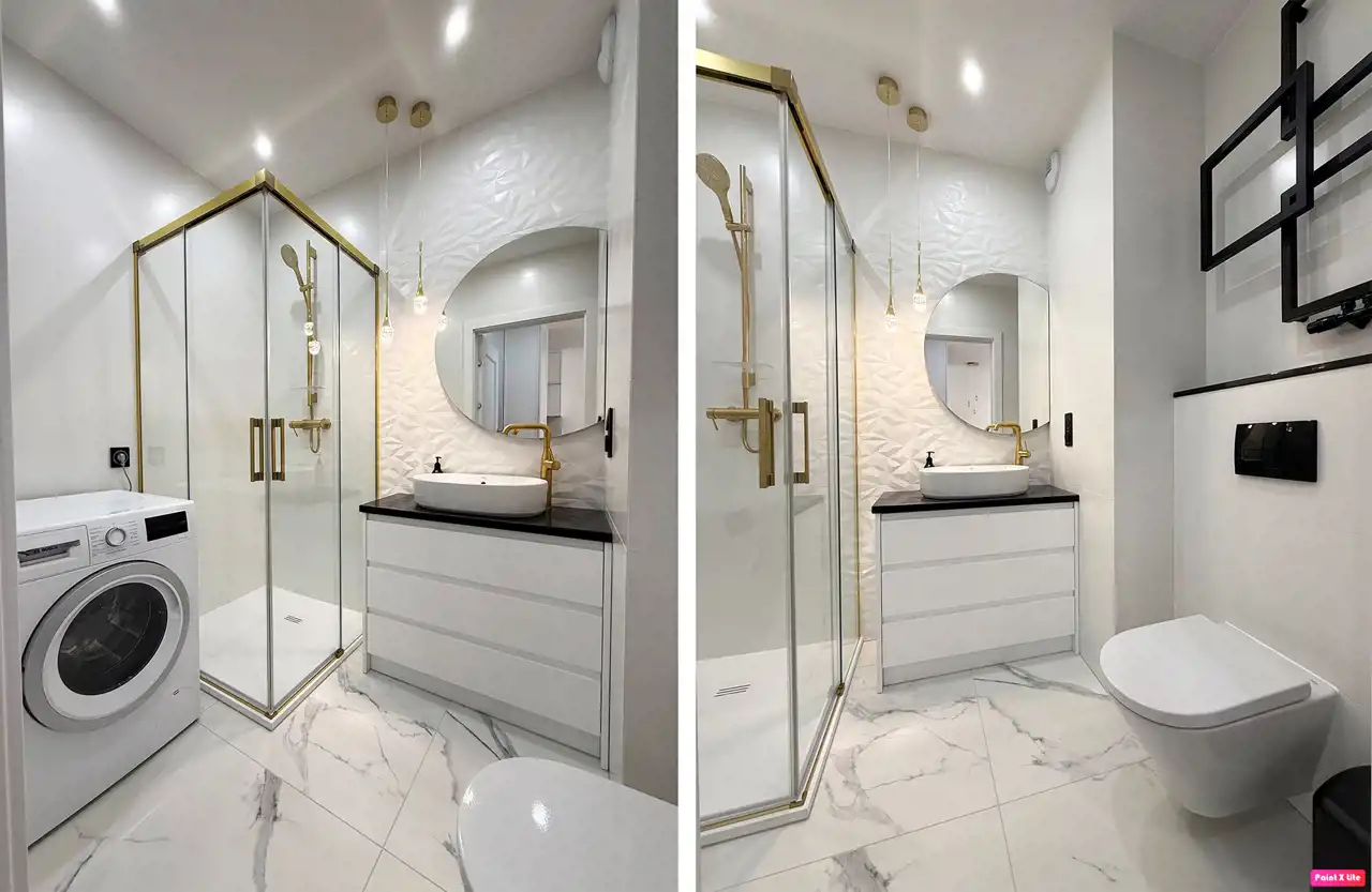 Łazienka wyposażona jest w prysznic, umywalkę z szafką, pralkę oraz WC.