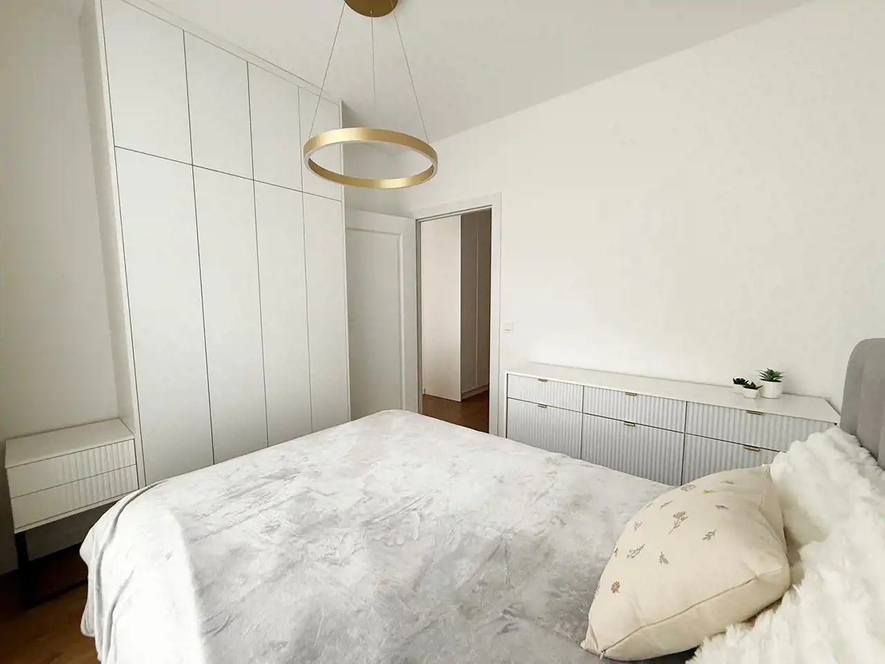 Sypialnia umeblowana jest w łóżko dwuosobowe, komodę oraz szafę.