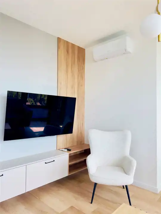 Apartament zaprojektowany przez architekta, jego głównymi zaletami jest wysoka jakość wykończenia oraz uniwersalny styl. Ponadczasowy design, idealnie skomponowane materiały, kolorystyka. Wyposażony został w klimatyzację, w pełni umeblowany i wyposażony, gotowy do wprowadzenia od 1 lipca.