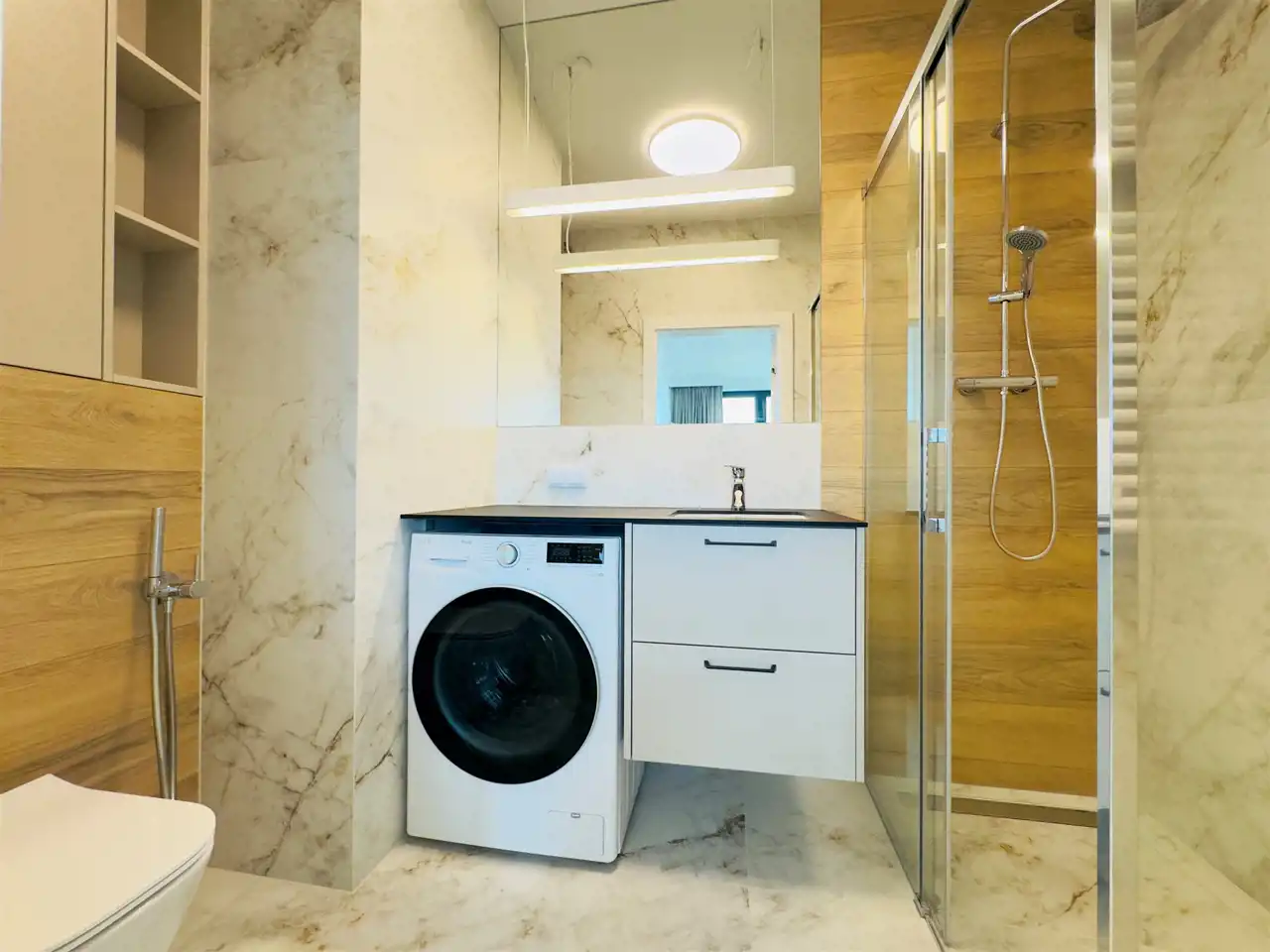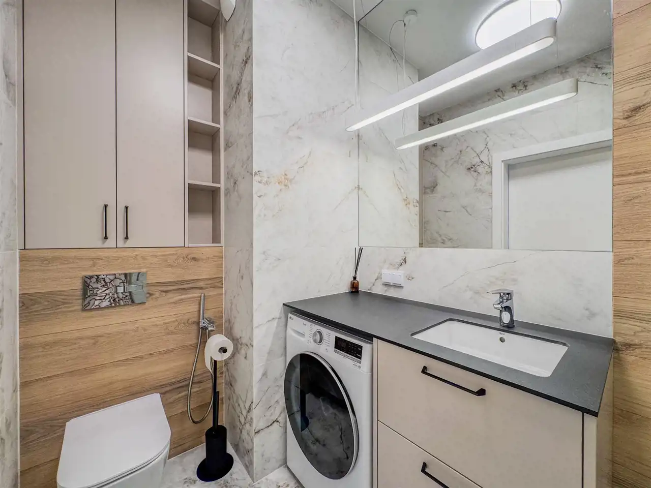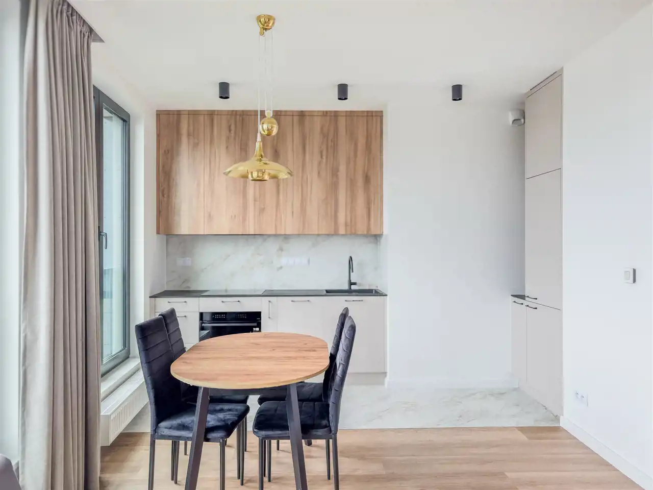 The apartment was designed by an architect, its main advantages are high quality finishing and universal style. Timeless design, perfectly composed materials and colors. It is equipped with air conditioning, fully furnished and equipped, ready to move in immediately.