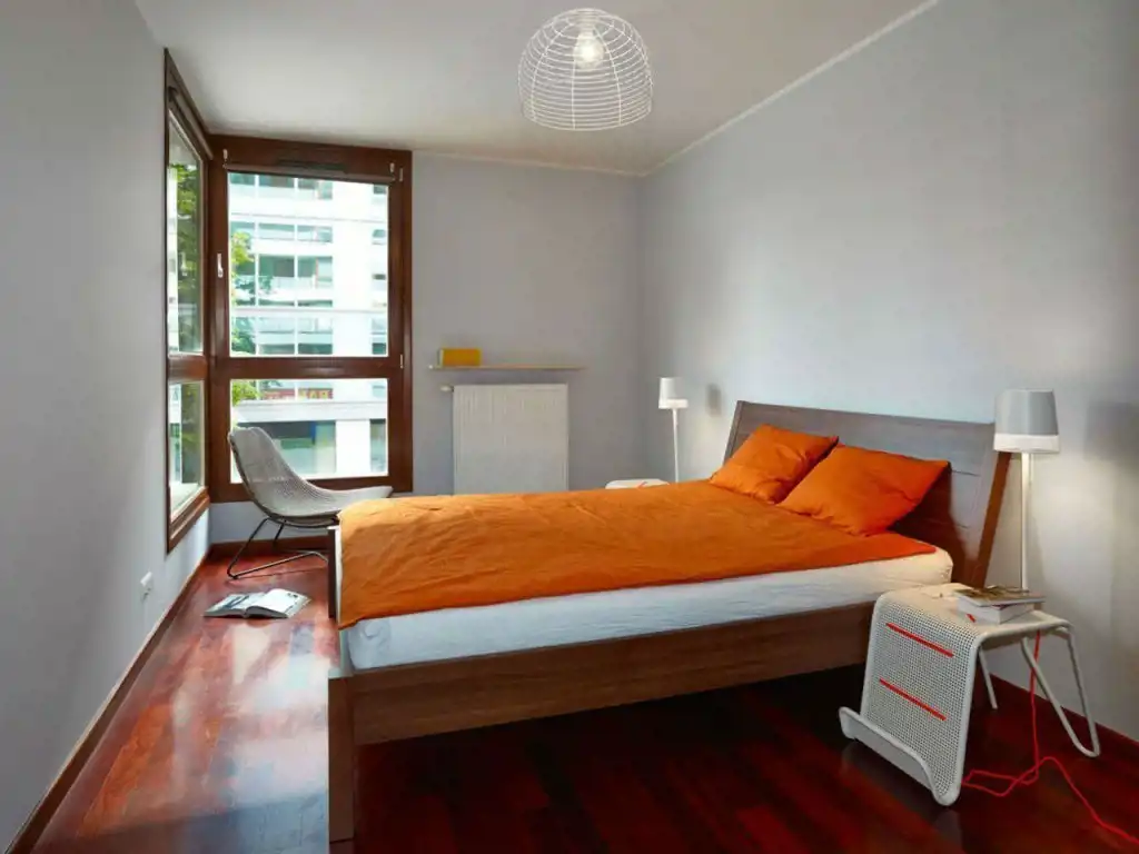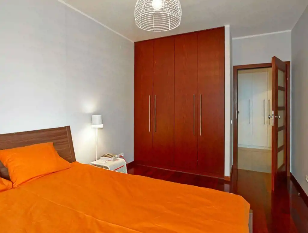 Sypialnia umeblowana w łózko małżeńskie oraz szafę w zabudowie.