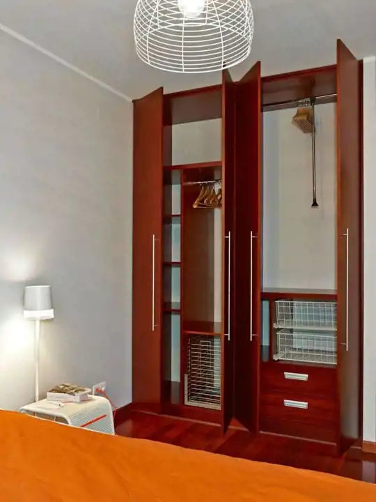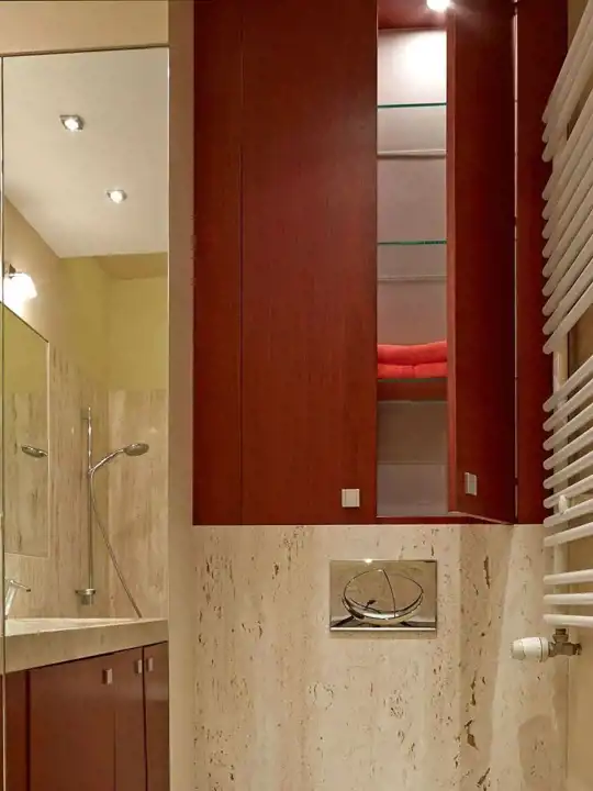 Mieszkanie składa się z częściowo połączonej z salonem kuchni w zabudowie (lodówka, zmywarka, piekarnik, płyta elektryczna, okap kuchenny).