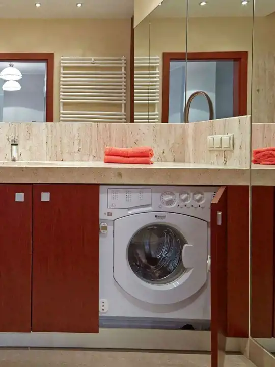 Łazienka wyposażona w wannę z prysznicem, pralkę, umywalkę oraz WC. W przedpokoju jest szafa wnękowa.