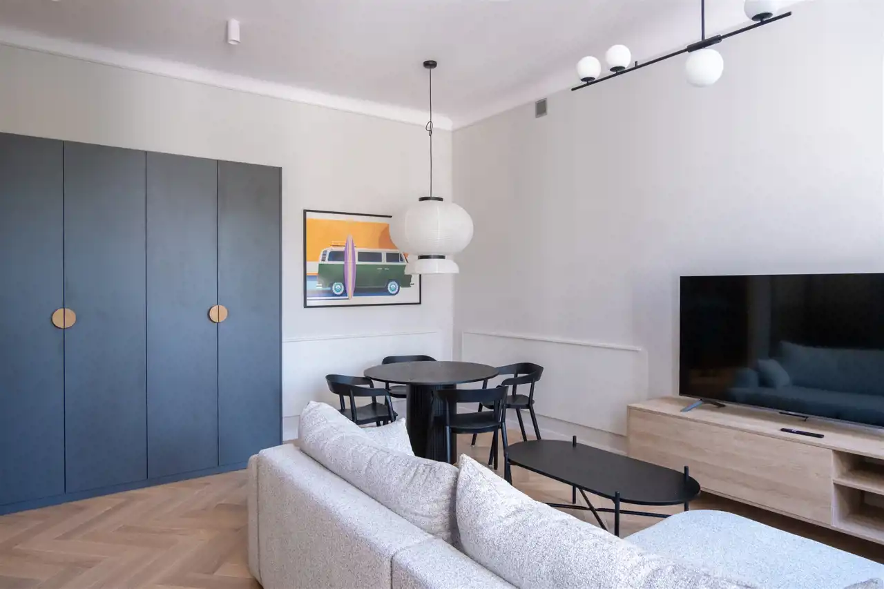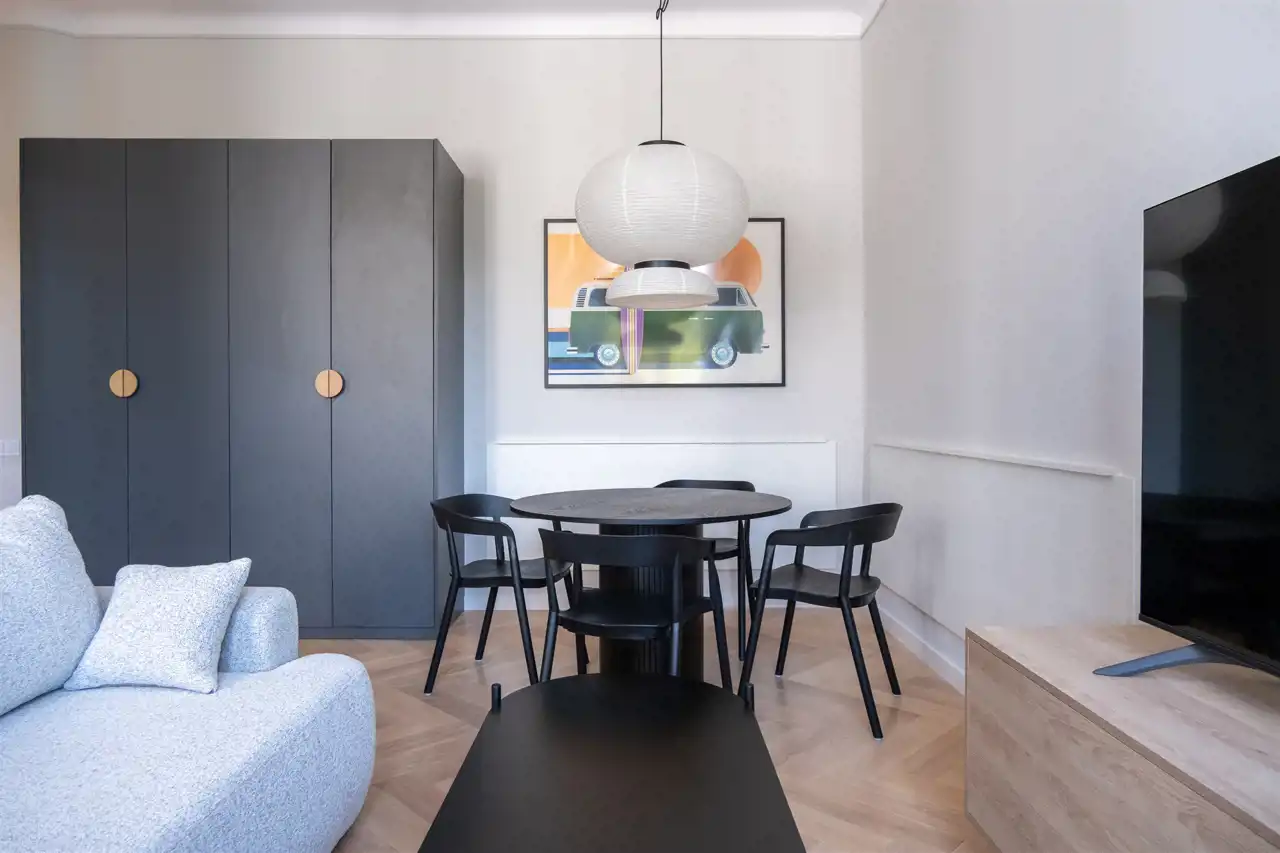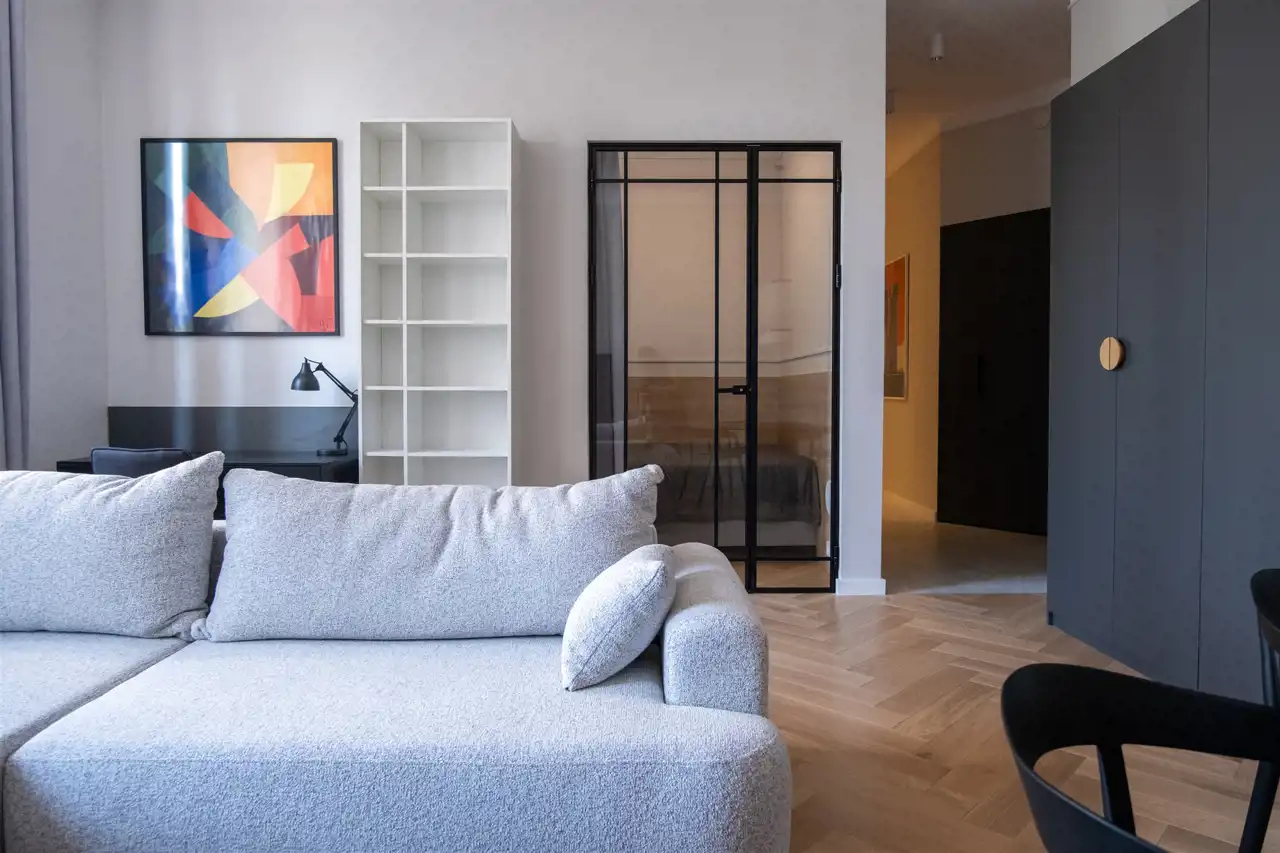 Mieszkanie składa się z obszernego salonu z miejscem do wypoczynku i kącikiem do pracy.