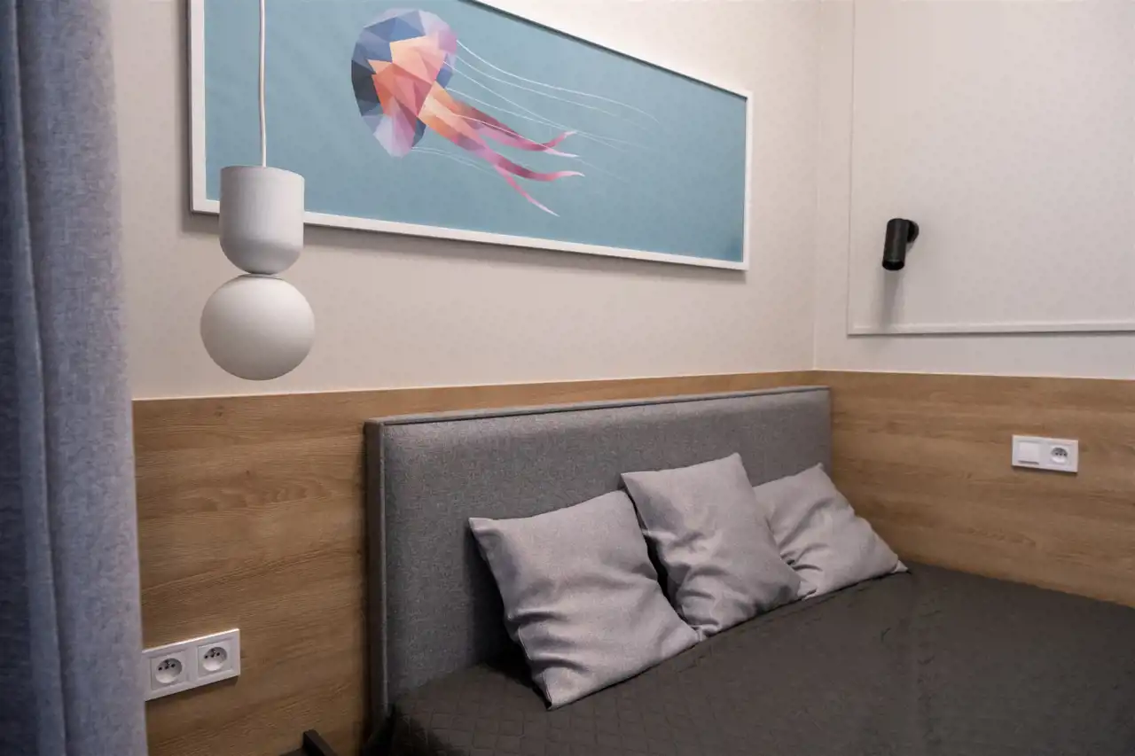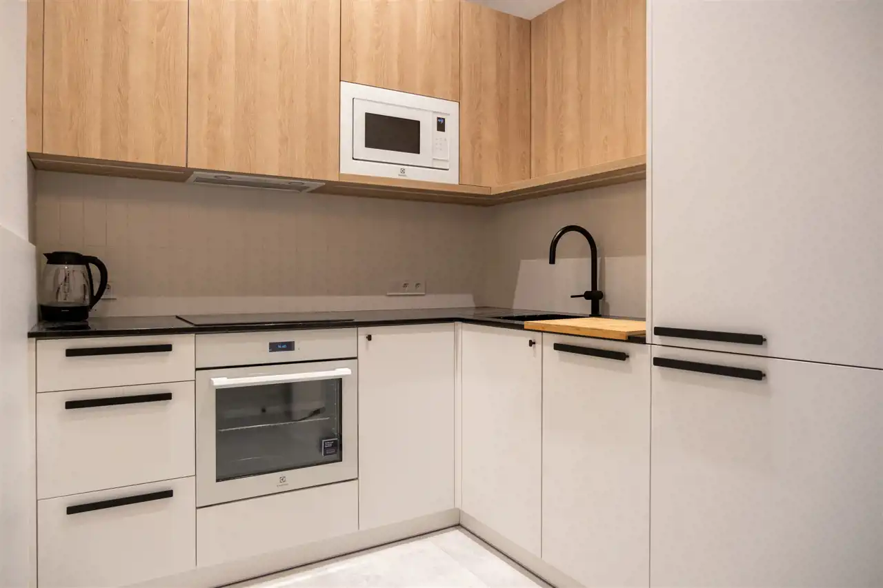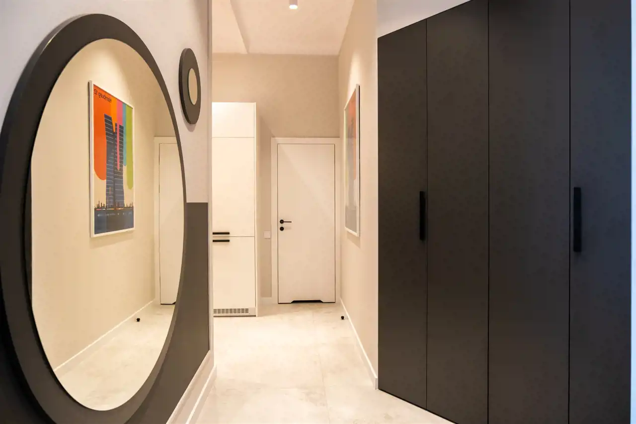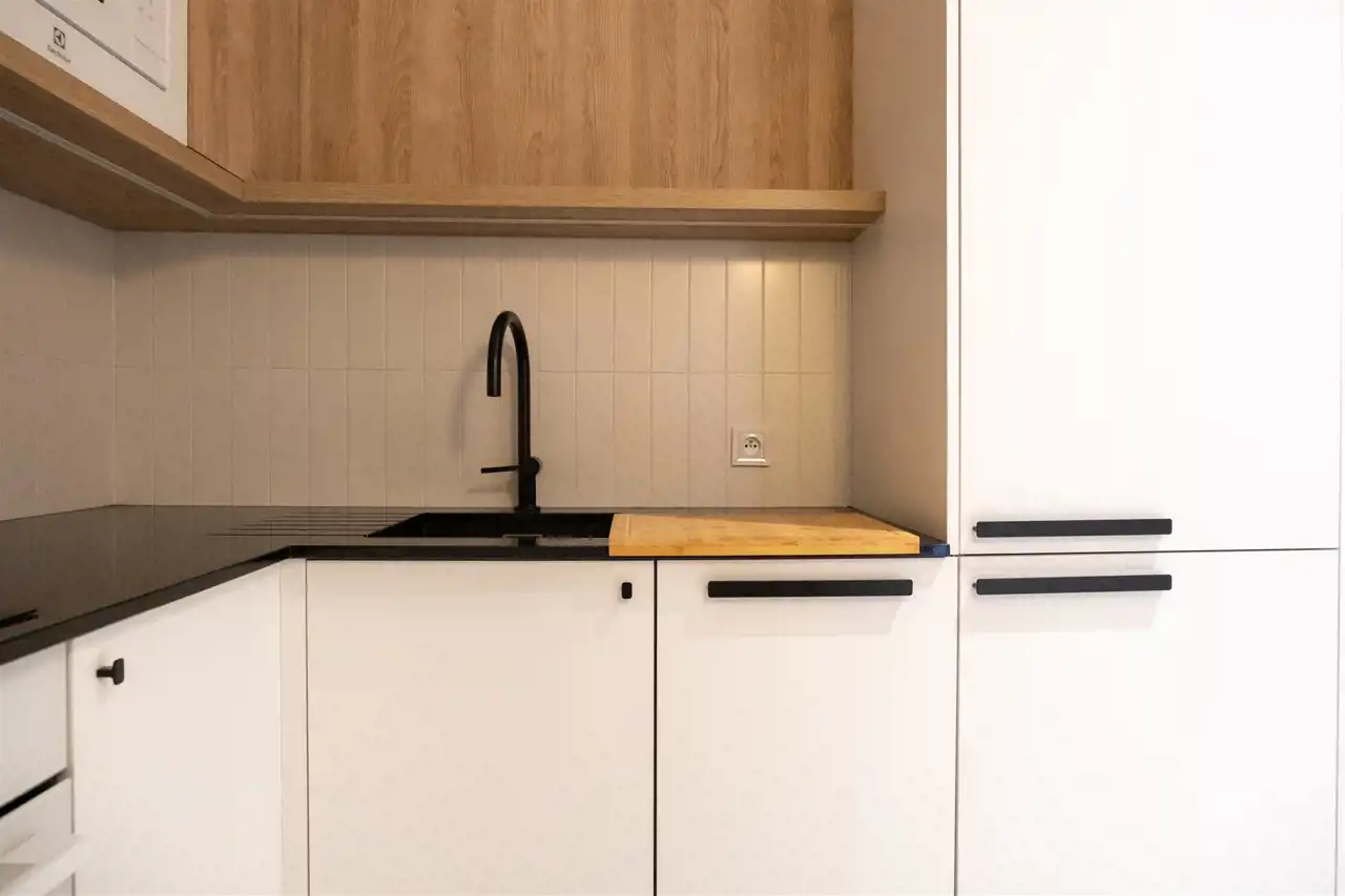 Mieszkanie składa się z obszernego salonu z miejscem do wypoczynku i kącikiem do pracy.