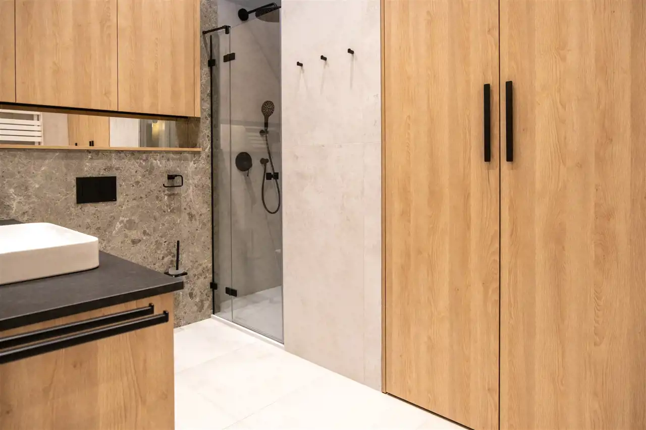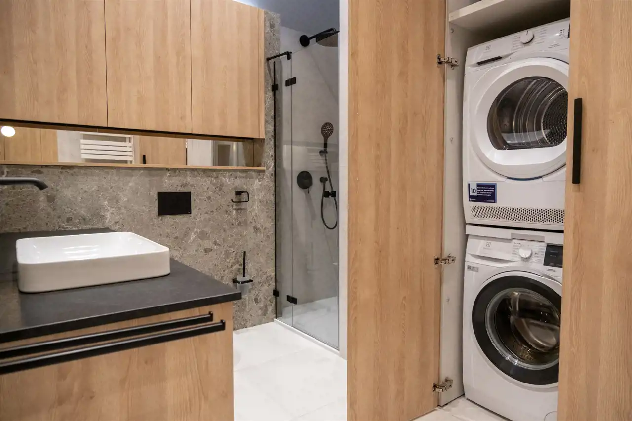 Łazienka przestronna z kabiną prysznicową, wyposażona w pralkę i suszarkę.