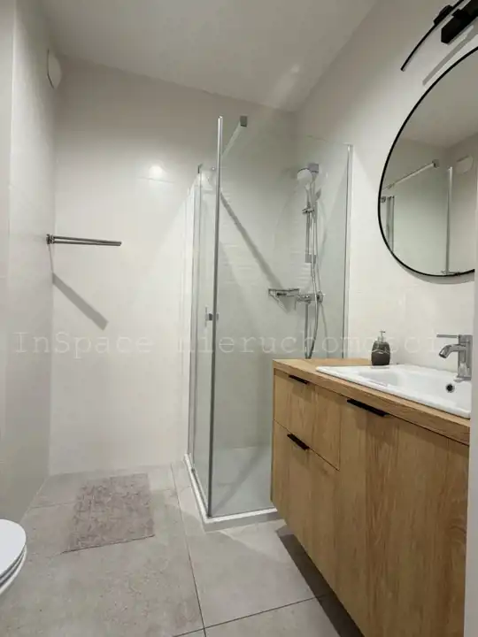 -Łazienka wyposażona w kabinę prysznicową, umywalkę oraz WC.