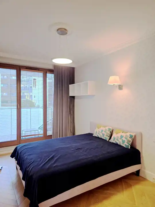 * Sypialnia z dużą, szafą garderobianą, łóżkiem małżeńskim i wyjściem na loggię