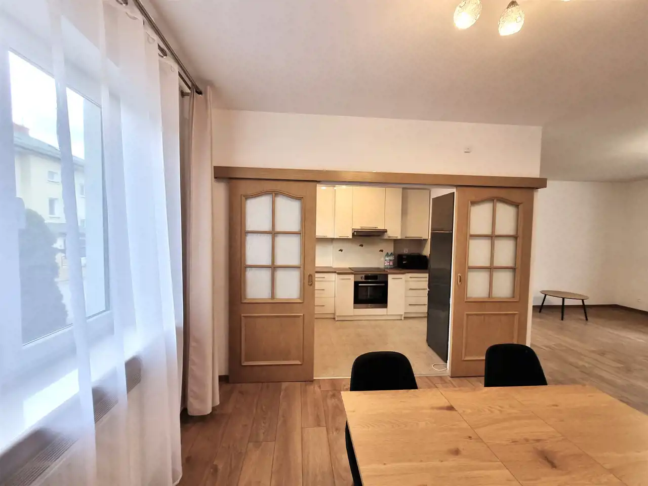 Mieszkanie na wysokim parterze, składa się z salonu z kuchnią, 3 sypialni, łazienki oraz wc. Jest nieumeblowane.