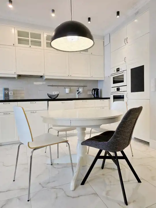 Posadzki wykonane z białego kamienia i pięknego parkietu. Drewniana stolarka.
