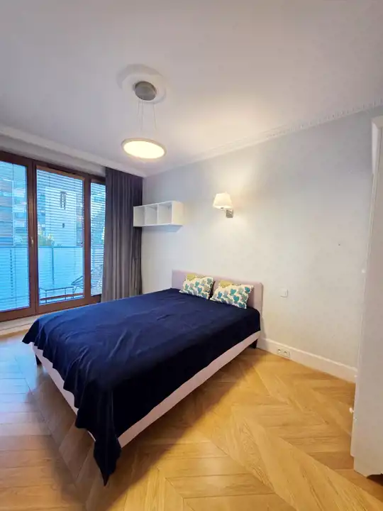 * Sypialnia z dużą, szafą garderobianą, łóżkiem małżeńskim i też wyjściem na loggię