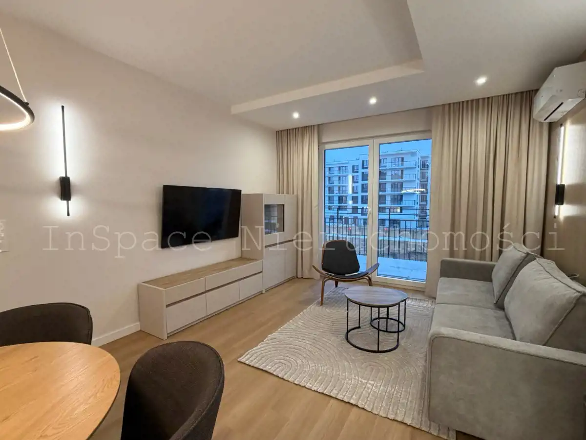 Salon - rozkładana sofa, stół z krzesłami, szafka RTV, telewizor, stolik kawowy, fotel, klimatyzacja oraz z wyjściem na balkon.
