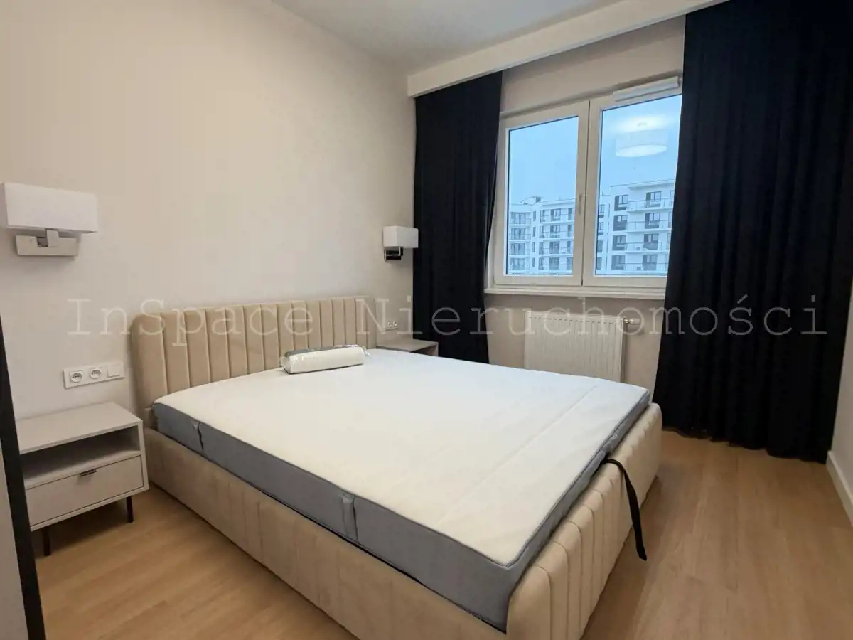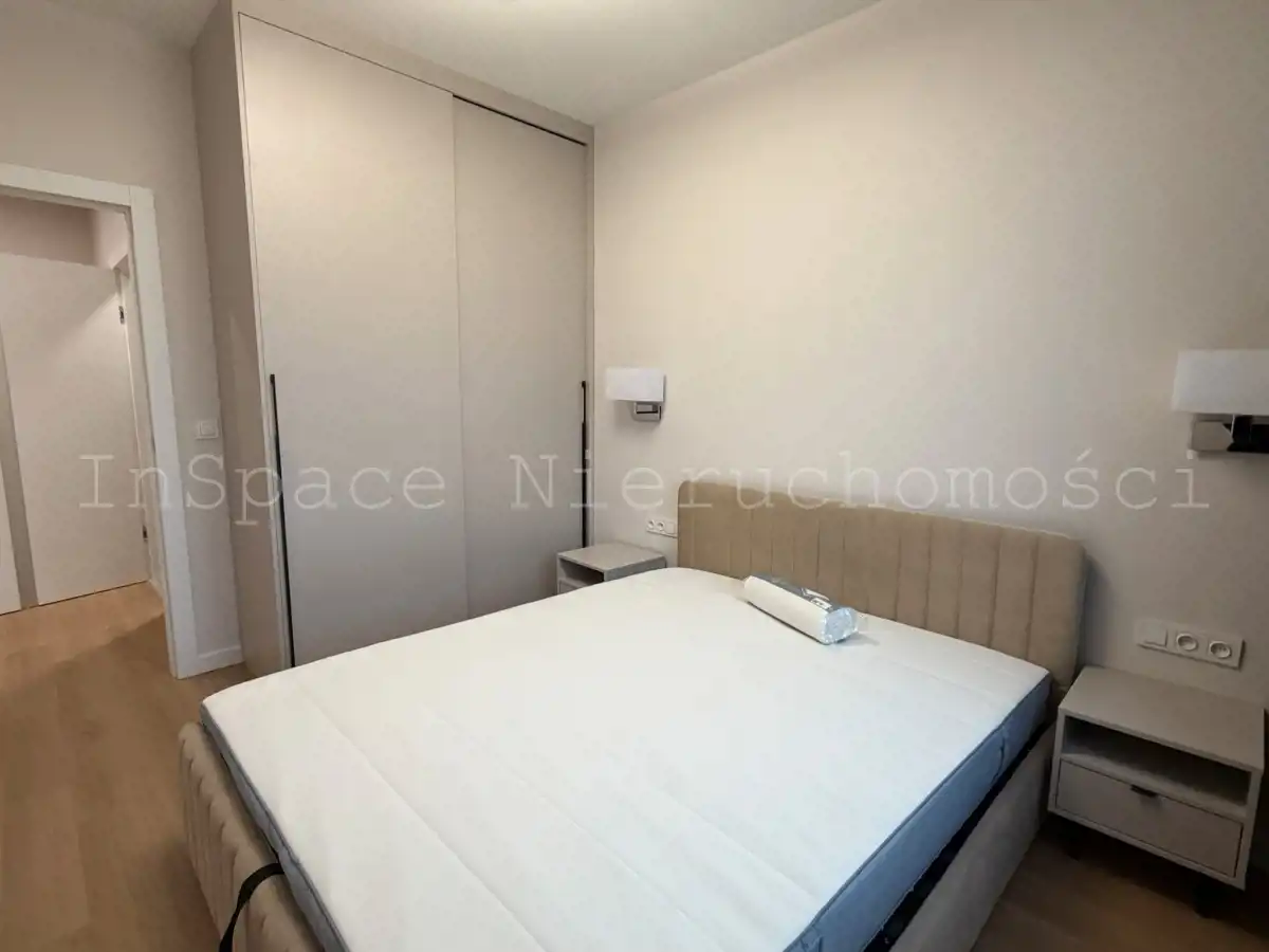 Sypialnia - łózko z materacem, 2 stoliki nocne, lampka nocna, szafa w zabudowie.