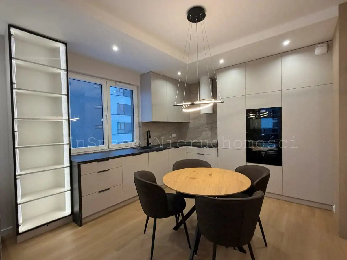 Aneks kuchenny - szafki w zabudowie, lodówko-zamrażarka, piekarnik, mikrofalówka, zmywarka, płyta indukcyjna, okap kuchenny.