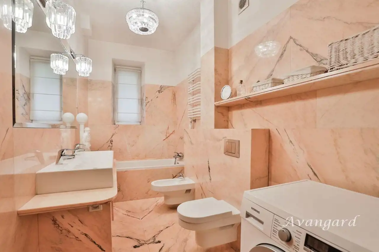 Trzy pokoje. Fantastyczny duży salon, główna sypialnia z garderobą, gabinet/sypialnia oraz oddzielna kuchnia. Pełna łazienka z wc oraz dodatkowa toaleta. Duży reprezentacyjny przedpokój z szafą na wierzchnie okrycia.