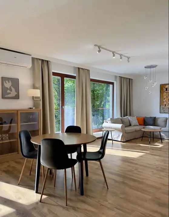 duże przeszklenia, okna salonu wychodzą na drzewa i budynki w których nikt nie mieszka