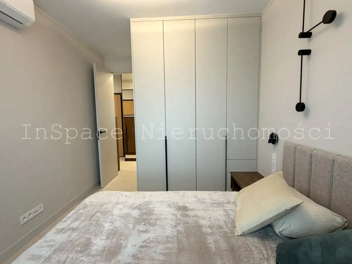 SYPIALNIA: łóżko 160 cm x 200 cm ze schowkiem, szafa w zabudowie, 2 stoliki nocne, lampki, dywanik, klimatyzacja, nowa pościel.