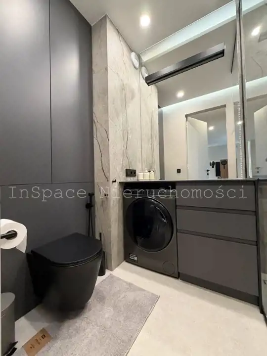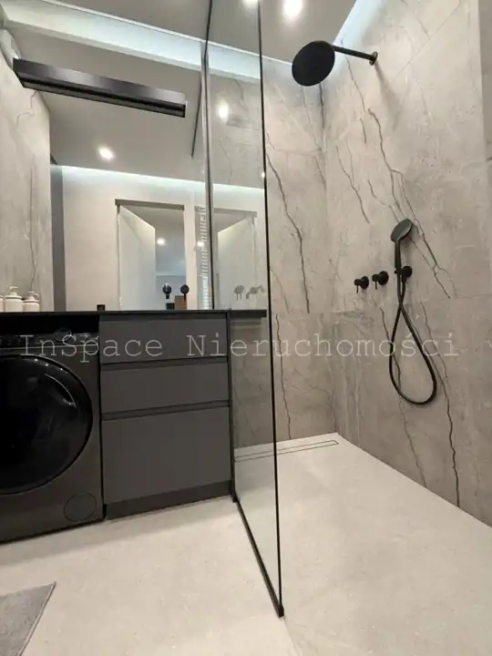 ŁAZIENKA: prysznic walk-in, pralko suszarka Haier, umywalka, WC, szafki. W łazience jest zamontowane ogrzewanie podłogowe.