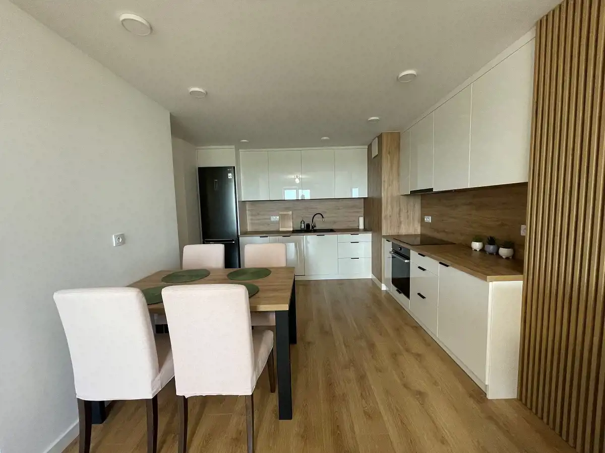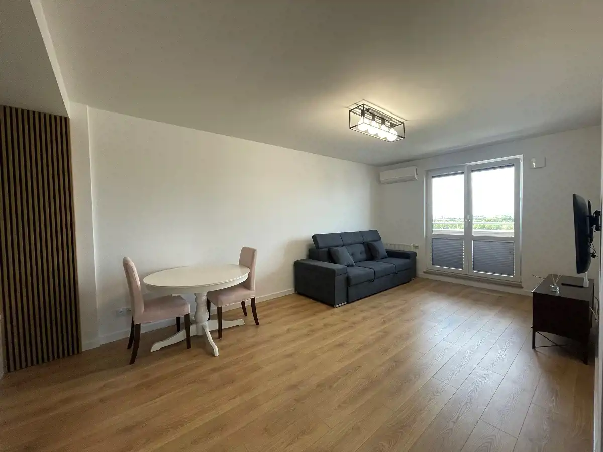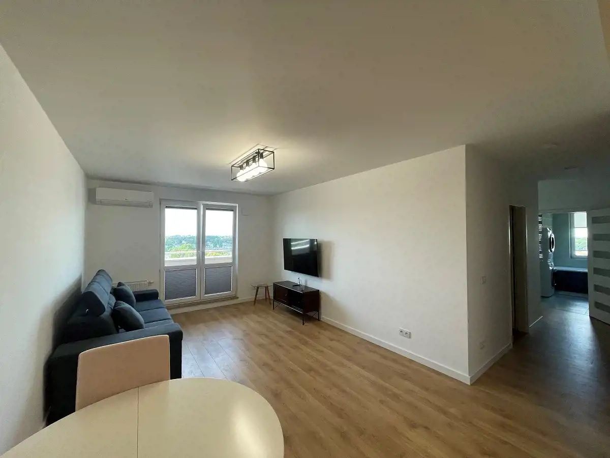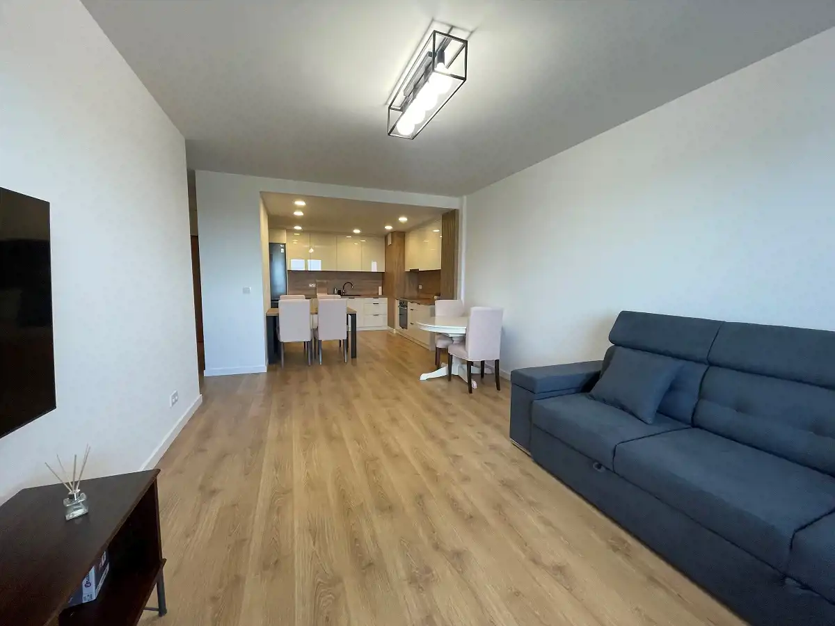 -Salon umeblowany w 2 stoły z krzesłami, rozkładaną sofę, stolik kawowy, stolik RTV, telewizor oraz z wyjściem na balkon.