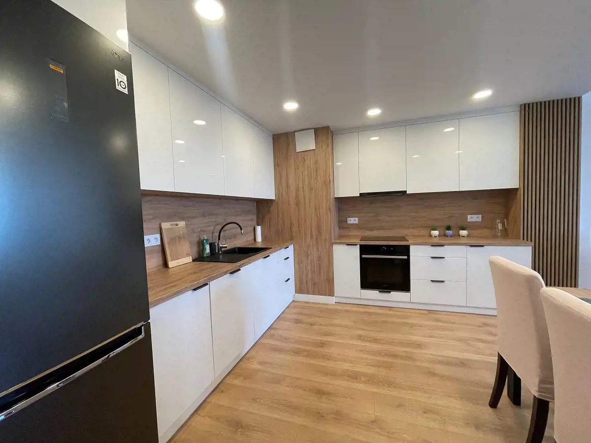 -Kuchnia w zabudowie (lodówka, zmywarka, piekarnik, płyta indukcyjna, okap kuchenny).