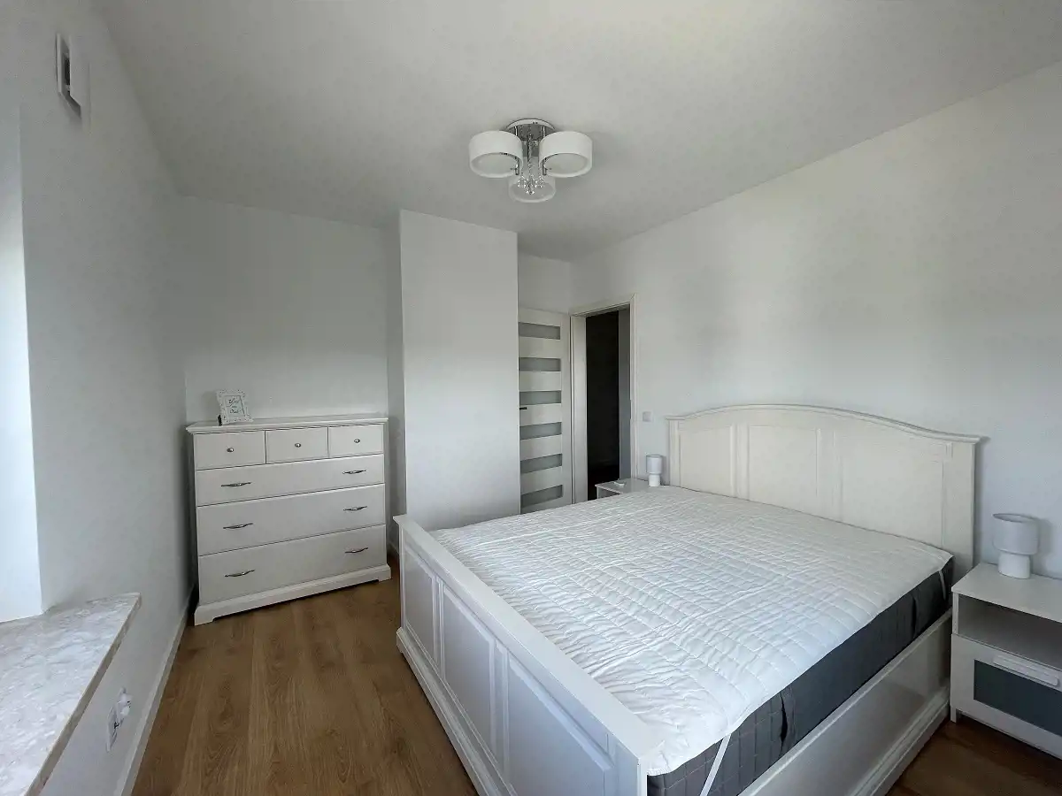 -Sypialnia umeblowana w łóżko dwuosobowe, 2 stoliki nocne, 2 lampki nocne, komodę oraz z drugim wyjściem na balon.