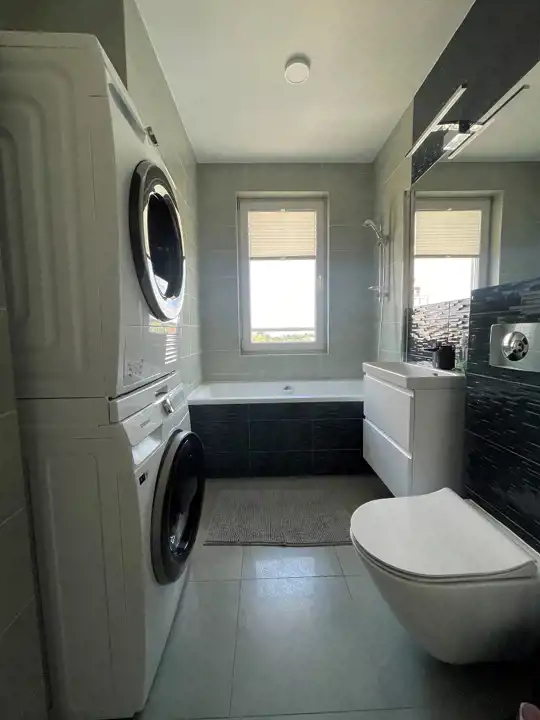 -Łazienka wyposażona w wannę z funkcją prysznica, umywalkę, pralkę, suszarkę oraz WC.