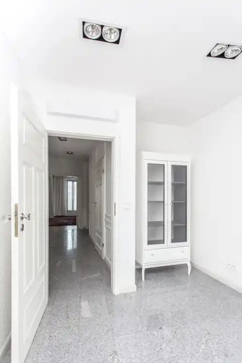 W holu szafy wnękowe. Duże wyciszane drewniane okna z żaluzjami drewnianymi. System nawiewu świeżego powietrza do mieszkania.