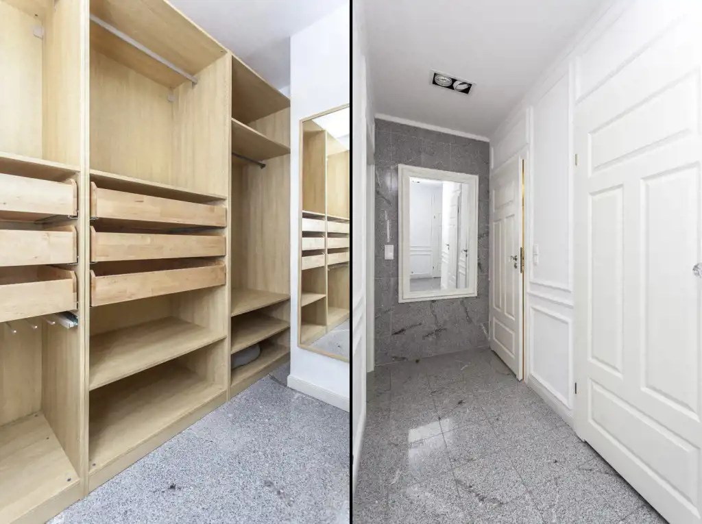In the closet cabinets in the lobby. Large silenced wooden windows with wooden shutters. Fresh air supply system for the apartment.
