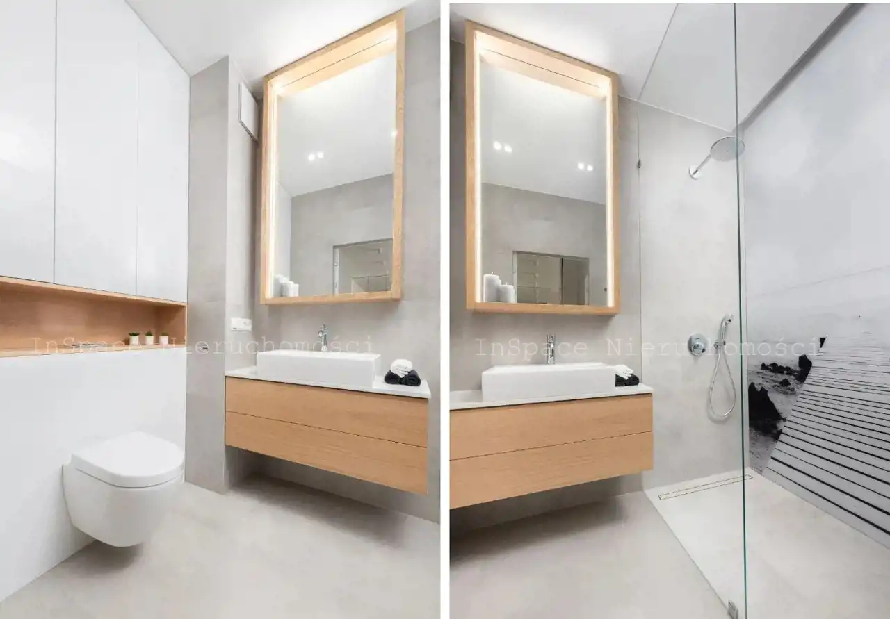 - nowoczesna łazienka z kabiną prysznicową, pralko-suszarką, umywalką i WC