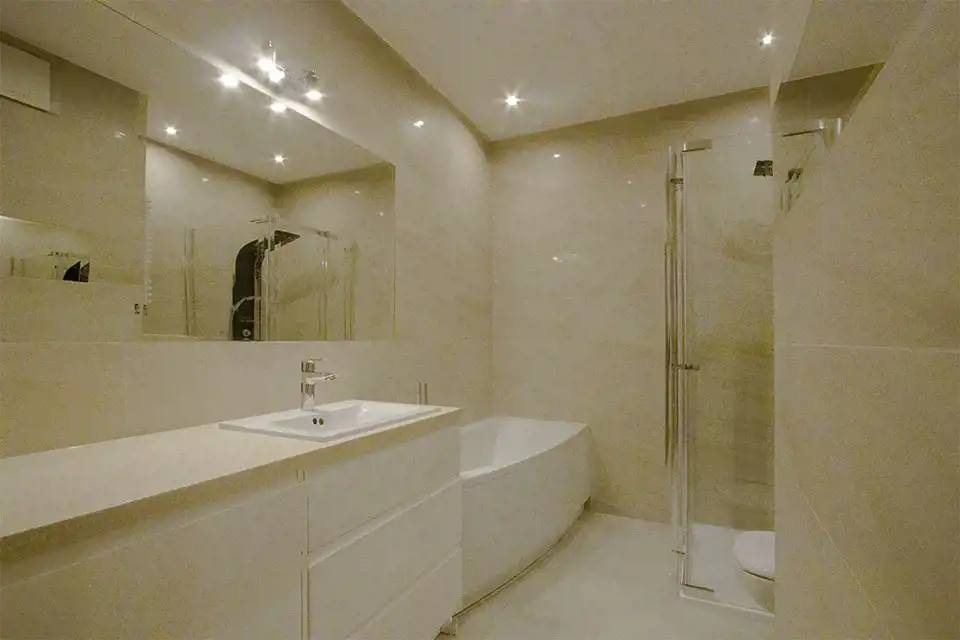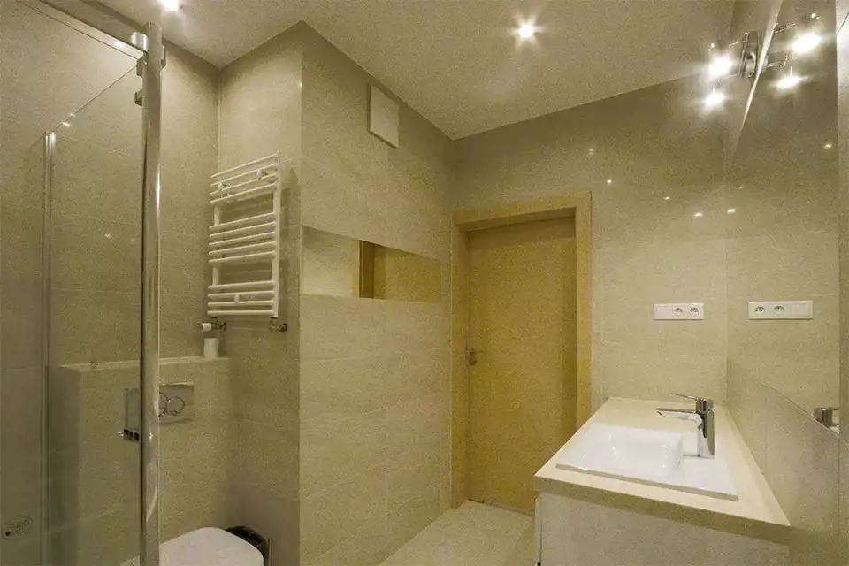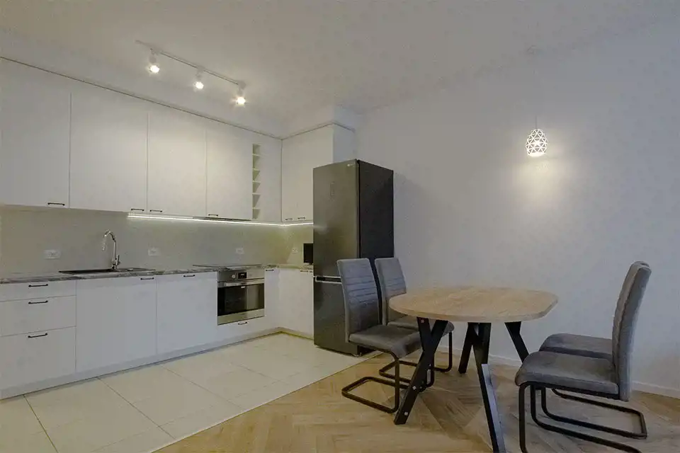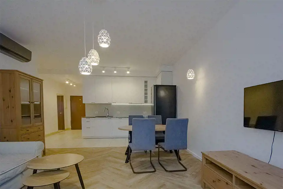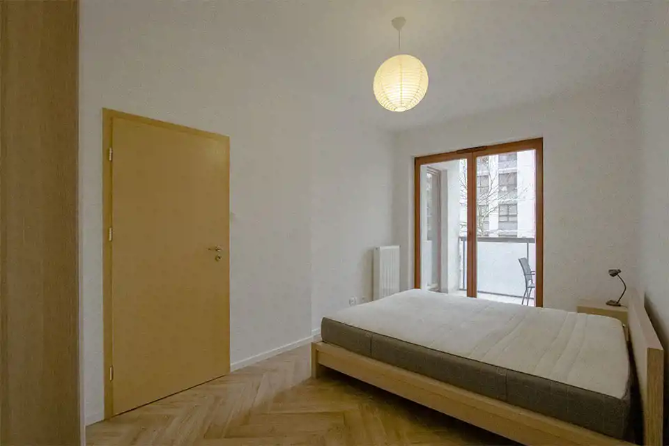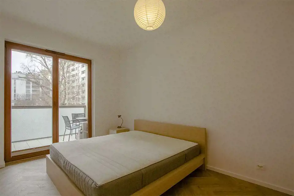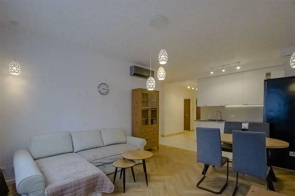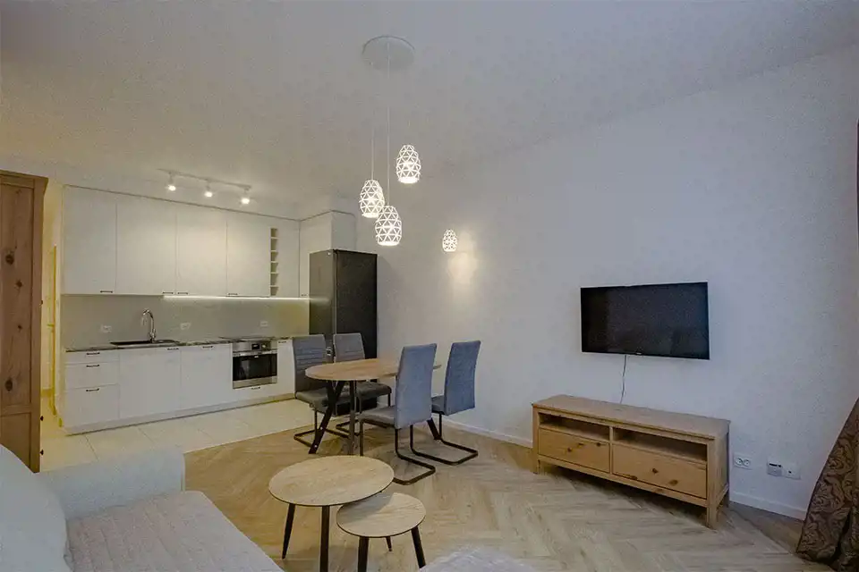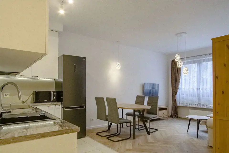 Apartament w wysokim standardzie wykończenia, w pięknym stylu, w jasnych kolorach. Kuchnia wyposażona w sprzęt AGD (płyta indukcyjna, zmywarka, piekarnik, lodówka, okap). W salonie klimatyzacja. 2 łazienki z czego jedna z prysznicem a druga z wanną i prysznicem. Na podłodze w kuchni, przedpokoju oraz łazienkach gres, natomiast w pokojach wysokiej klasy panele podłogowe. Sypialnia z dużym łożem małżeńskim oraz z szafą. Nowoczesne oświetlenie LED w całym mieszkniu.