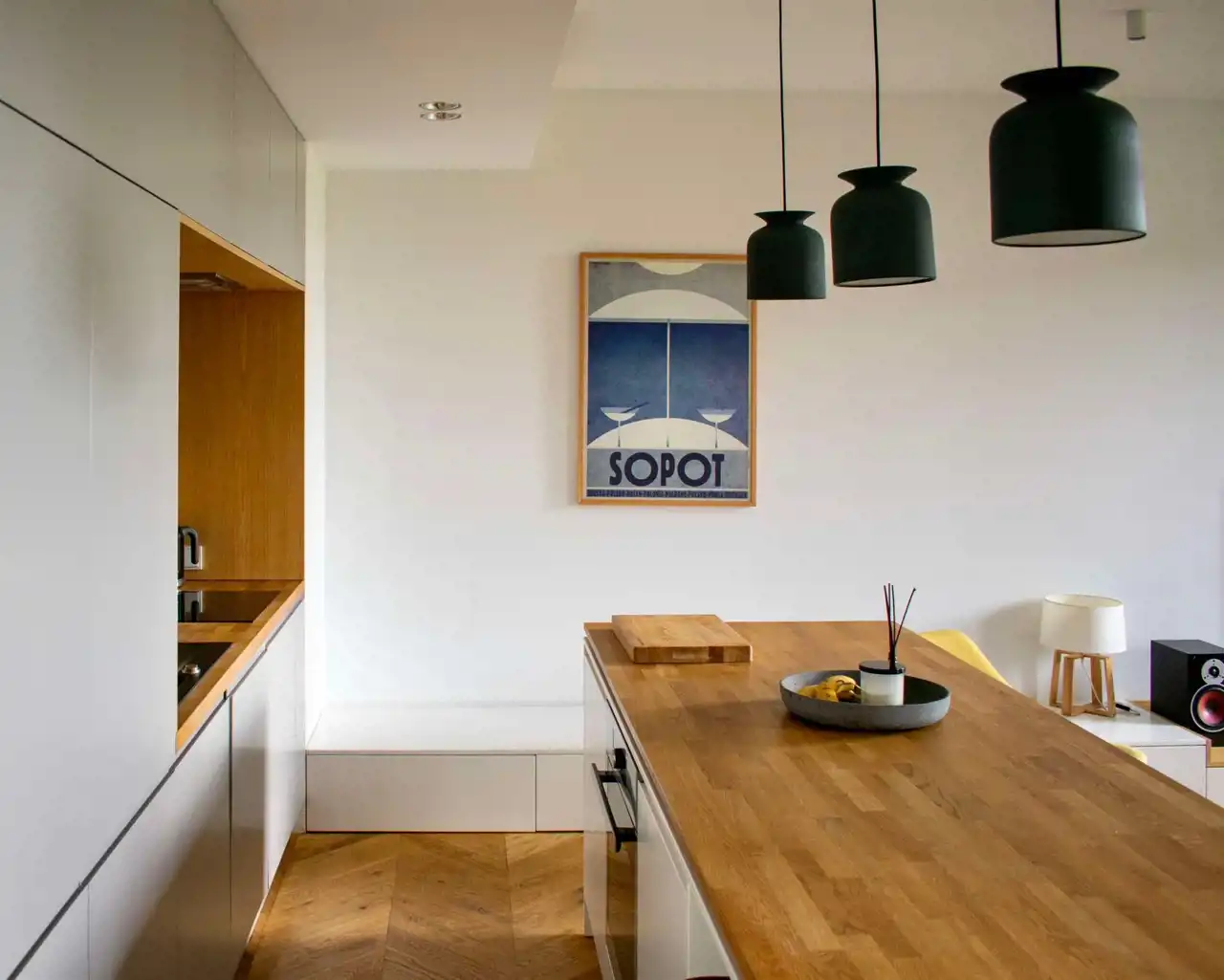 Mieszkanie składa się z otwartej na salon kuchni w zabudowie (lodówka, zmywarka, piekarnik, płyta indukcyjna, pralka, okap kuchenny).