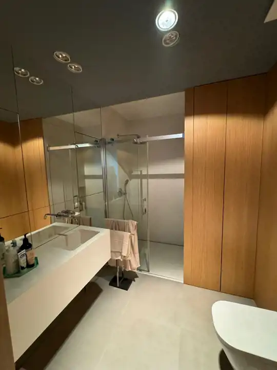 -ŁAZIENKA: kabina walk-in, pralka, umywalka, szafki, WC.
