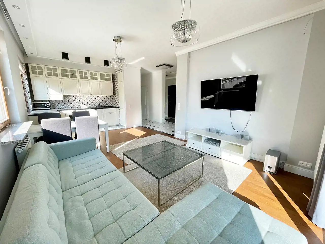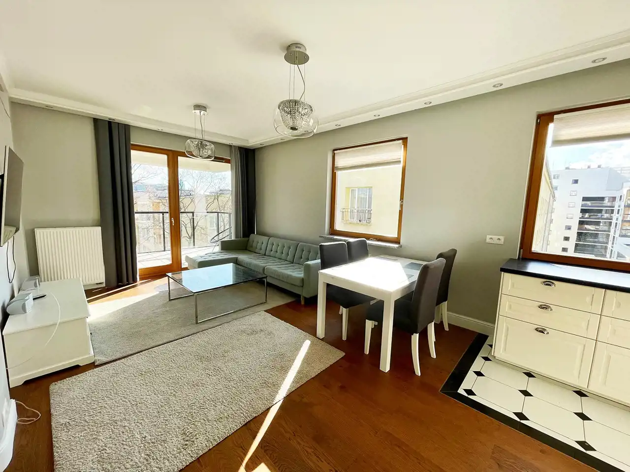 Salon umeblowany w stół z krzesłami, sofę rozkładaną, szafkę RTV oraz z wyjściem na duży balkon.