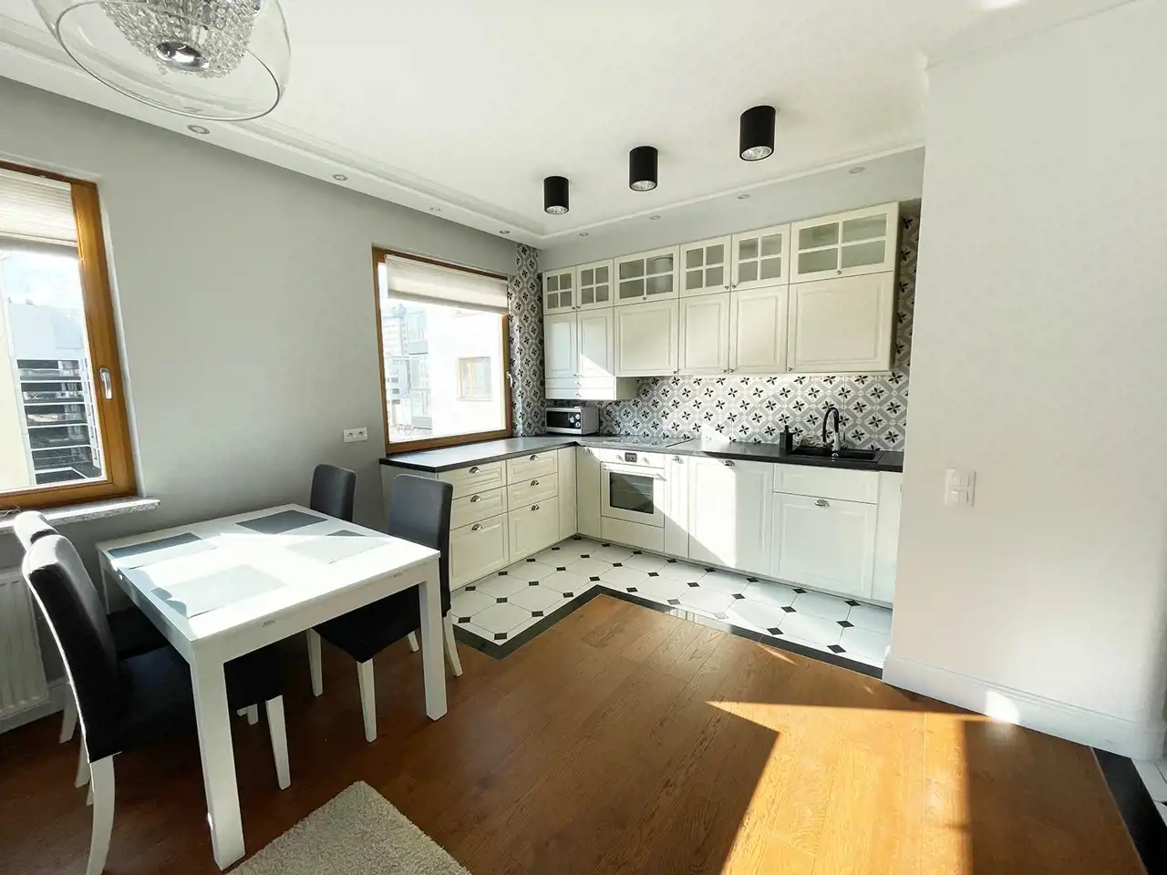 Mieszkanie składa się z otwartej na salon kuchni w zabudowie (lodówka, zmywarka, piekarnik, płyta elektryczna, okap kuchenny).