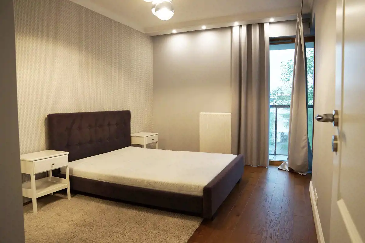 Duża sypialnia z szafą w zabudowie, łóżkiem małżeńskim oraz z wyjściem na balkon.