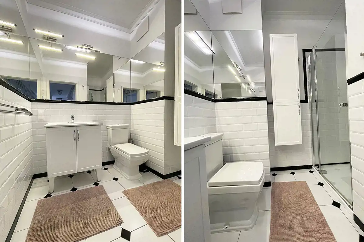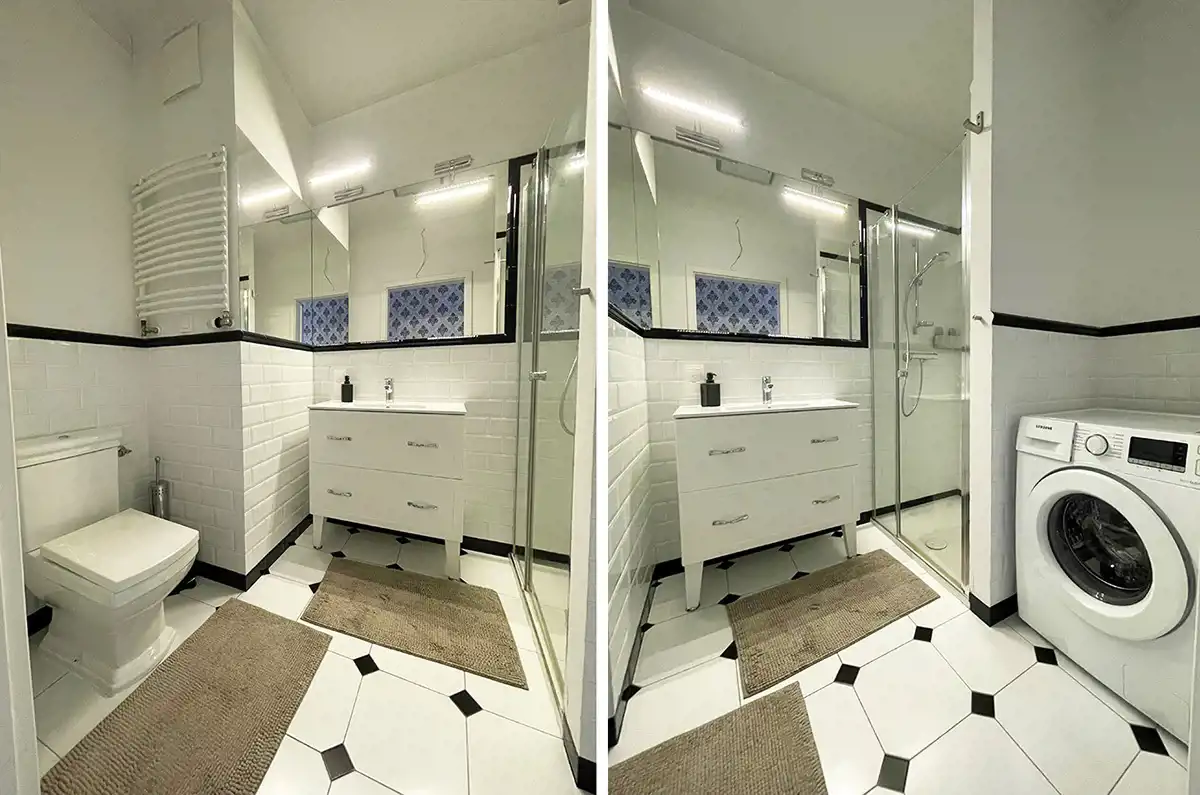 Dwie łazienki znajdują się w przedpokoju i są wyposażone w prysznice, umywalki, WC i pralkę.
