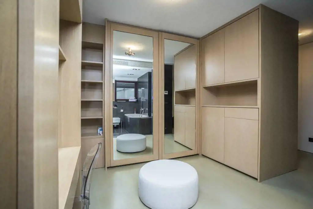 Large living room with half-open kitchen, study room, master bedroom - with walk-in closet and bathroom, utility room. Several closet, high end furniture, wooden flooring and more! Top floor so it is quiet and peaceful.