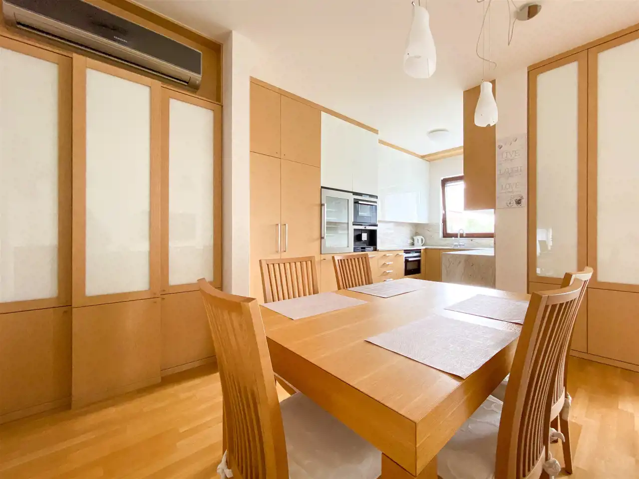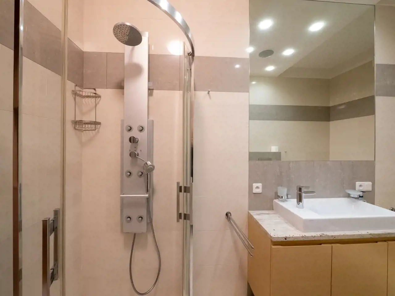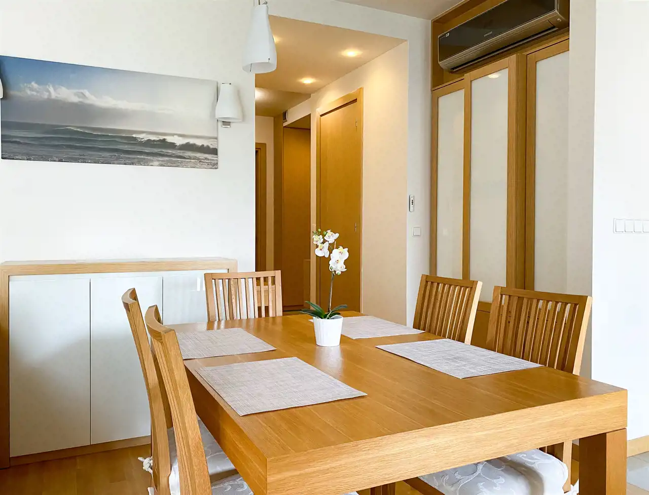 Apartment 89 m2 with air conditioning. It consists of a living room with a kitchen and a dining room, all equipped with top-class household appliances. 2 bedrooms, bathroom with a bathtub and a shower cabin, and a toilet, hall, laundry room, 2 balconies (one balcony on the west side, the other on the east side), 1 parking space in the garage - additionally payable (optional 2nd place), storage room. Completely equipped and furnished. Free right now.