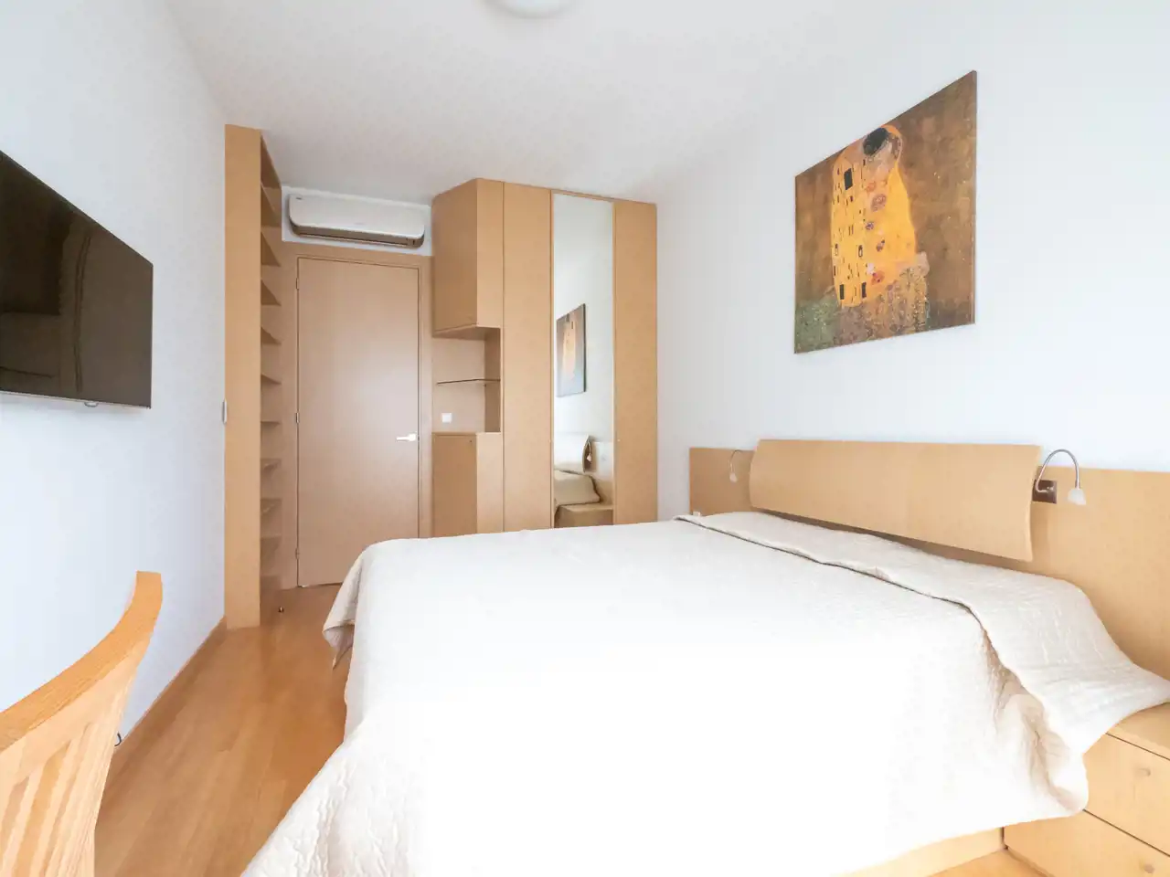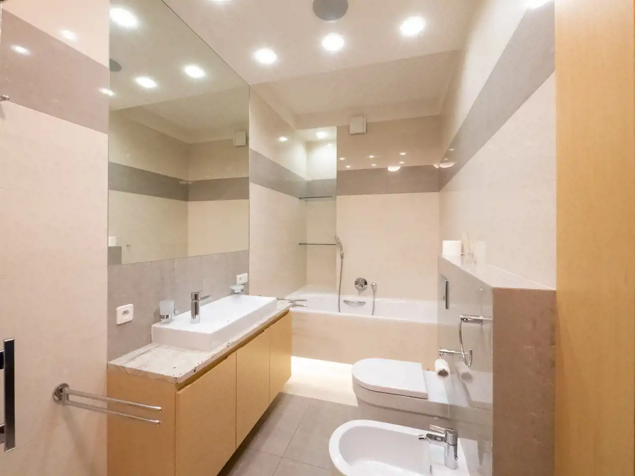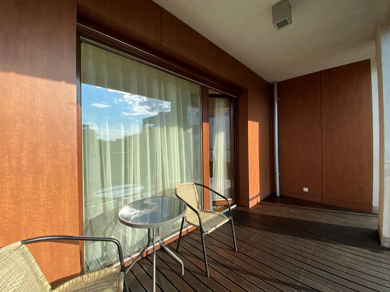 Apartment 89 m2 with air conditioning. It consists of a living room with a kitchen and a dining room, all equipped with top-class household appliances. 2 bedrooms, bathroom with a bathtub and a shower cabin, and a toilet, hall, laundry room, 2 balconies (one balcony on the west side, the other on the east side), 1 parking space in the garage - additionally payable (optional 2nd place), storage room. Completely equipped and furnished. Free right now.