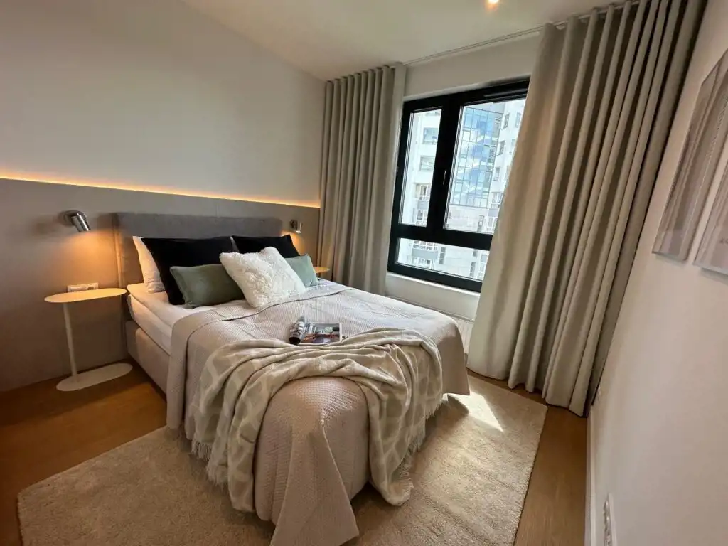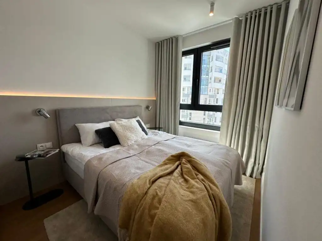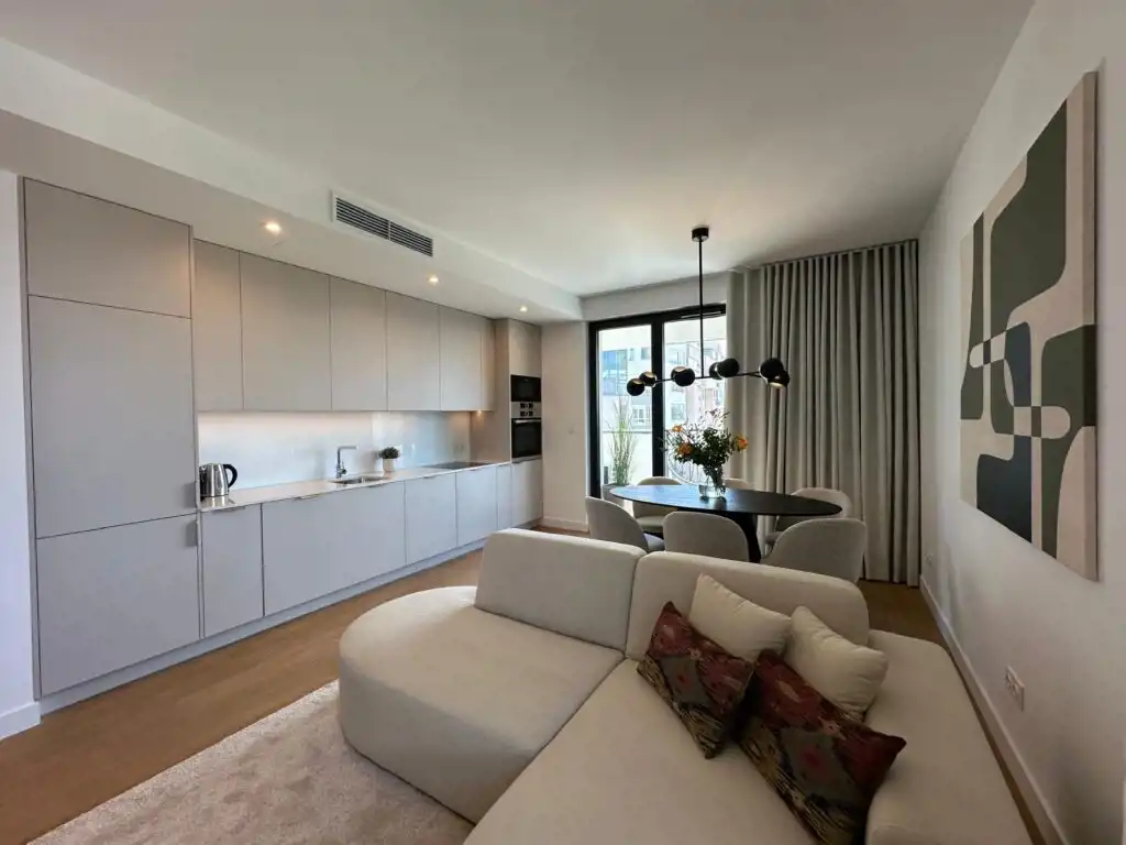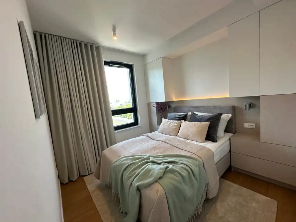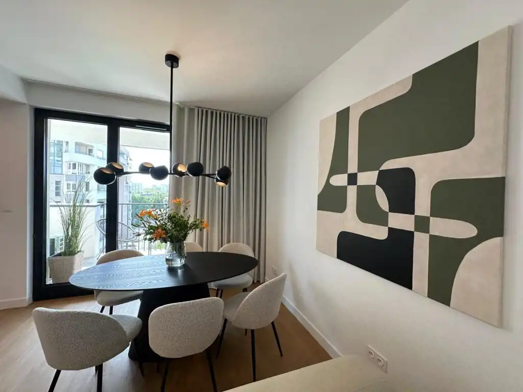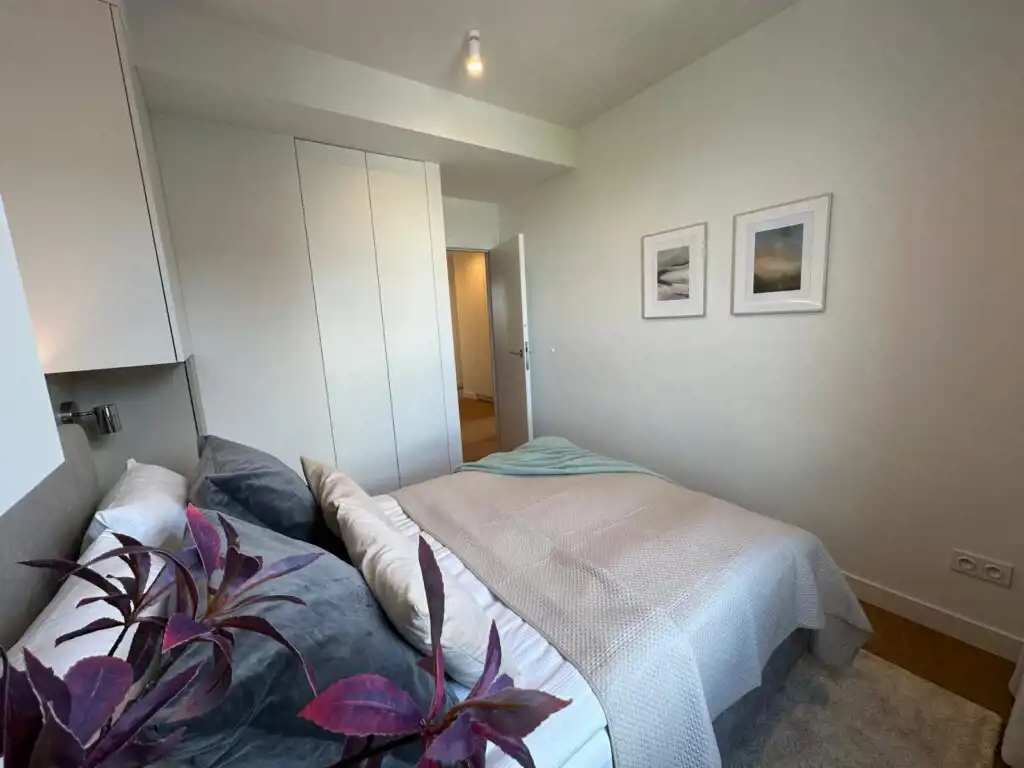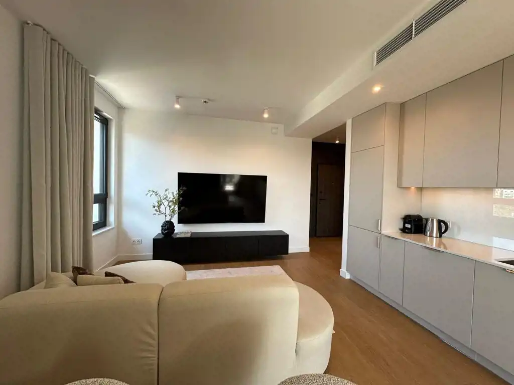 Mieszkanie zostało zaprojektowane przez architekta wnętrz, wyposażone w pełną zabudowę kuchni oraz wszystkie sprzęty agd. Łazienka z wanną posiada również pralkę i suszarkę w zabudowie. Centralna klimatyzacja.