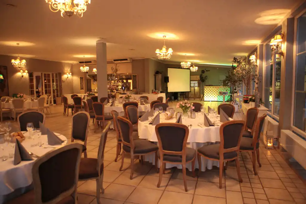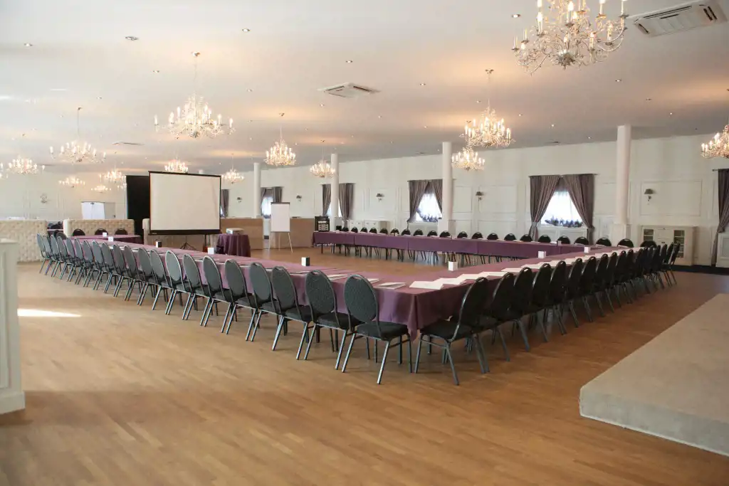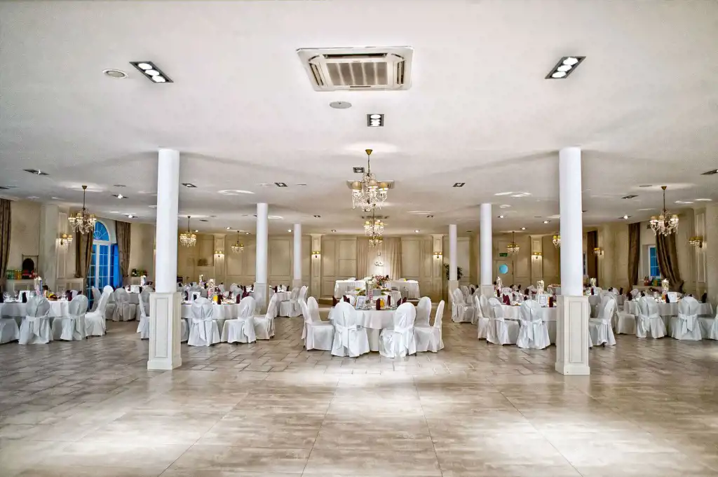 - klimatyzowane 2 sale weselno/bankietowe ( na 50 stołów okrągłych), mogące pomieścić odpowiednio pow.1000 m2 do 600 osób druga ok 600 m2 do 300 osób również do wykorzystania na potrzeby szkoleń czy konferencji ( nagłośnienie, multimedia-projektory)