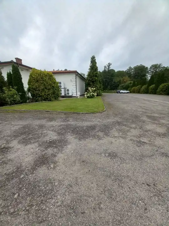 Na dużej, 5000 m , pięknie zadrzewionej, ogrodzonej działce został posadzony wolnostojący obiekt o powierzchni użytkowej 540 mkw z miejscami parkingowymi./ około 50 /