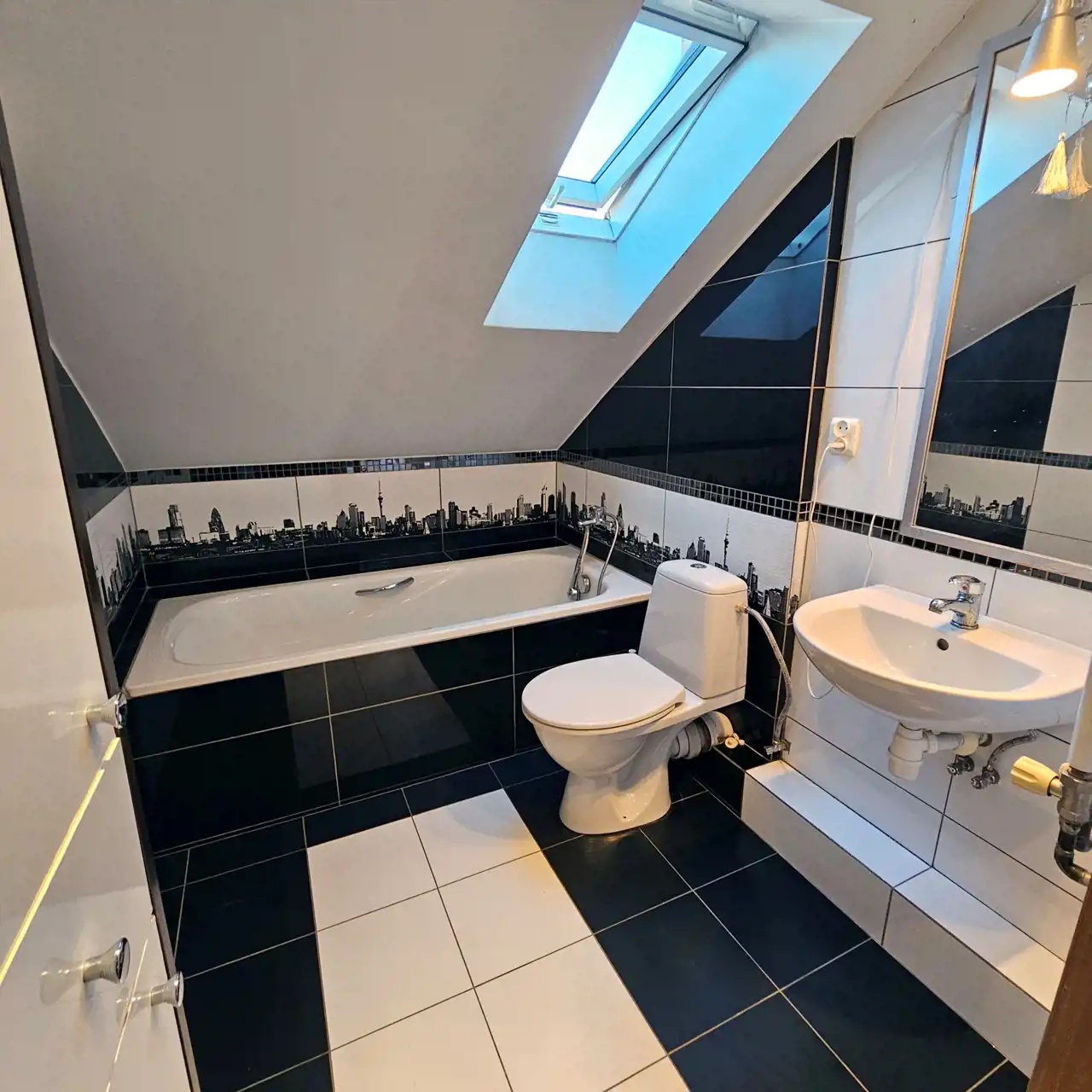Poddasze - Salon z aneksem kuchennym, sypialnia, łazienka z wanną i wc.