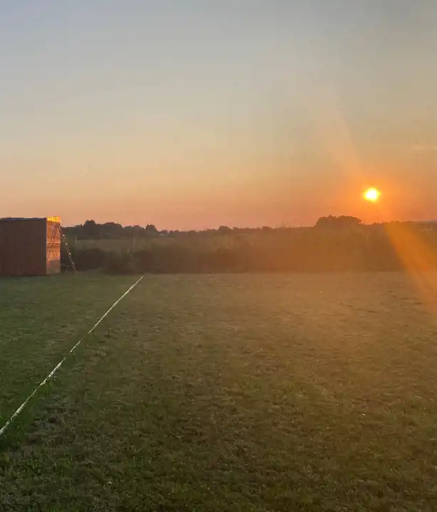 Widok z działek na okoliczne łąki. Dojazd główną aleją ogrodu do działek.