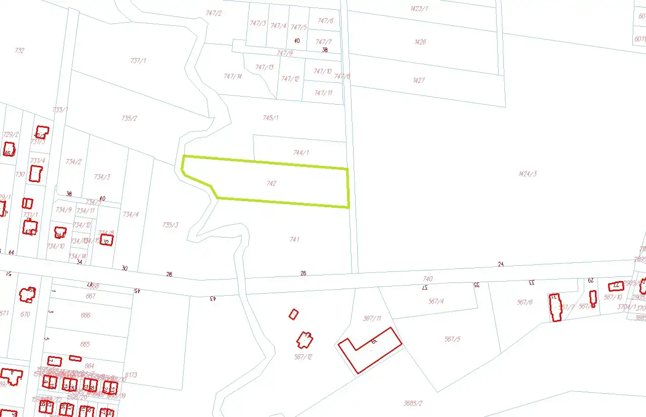 - Media Woda: brak; Kanalizacja: brak; Prąd: w ulicy; Gaz: brak