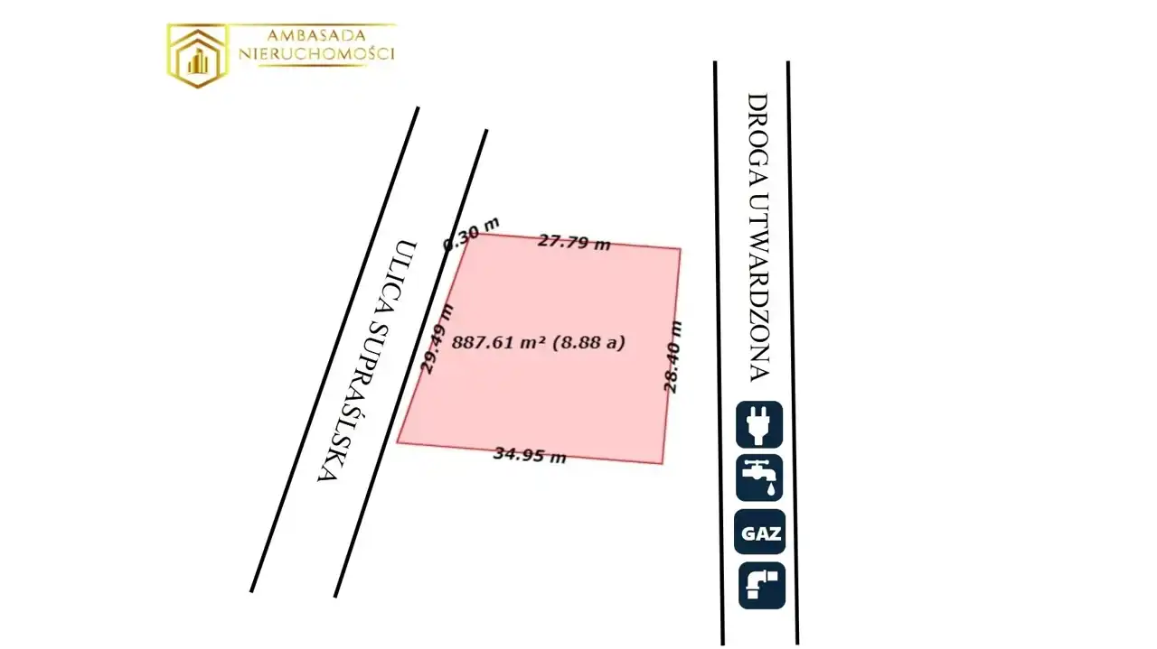 - Media Woda: tak; Kanalizacja: w pobliżu; Prąd: jest; Gaz: jest