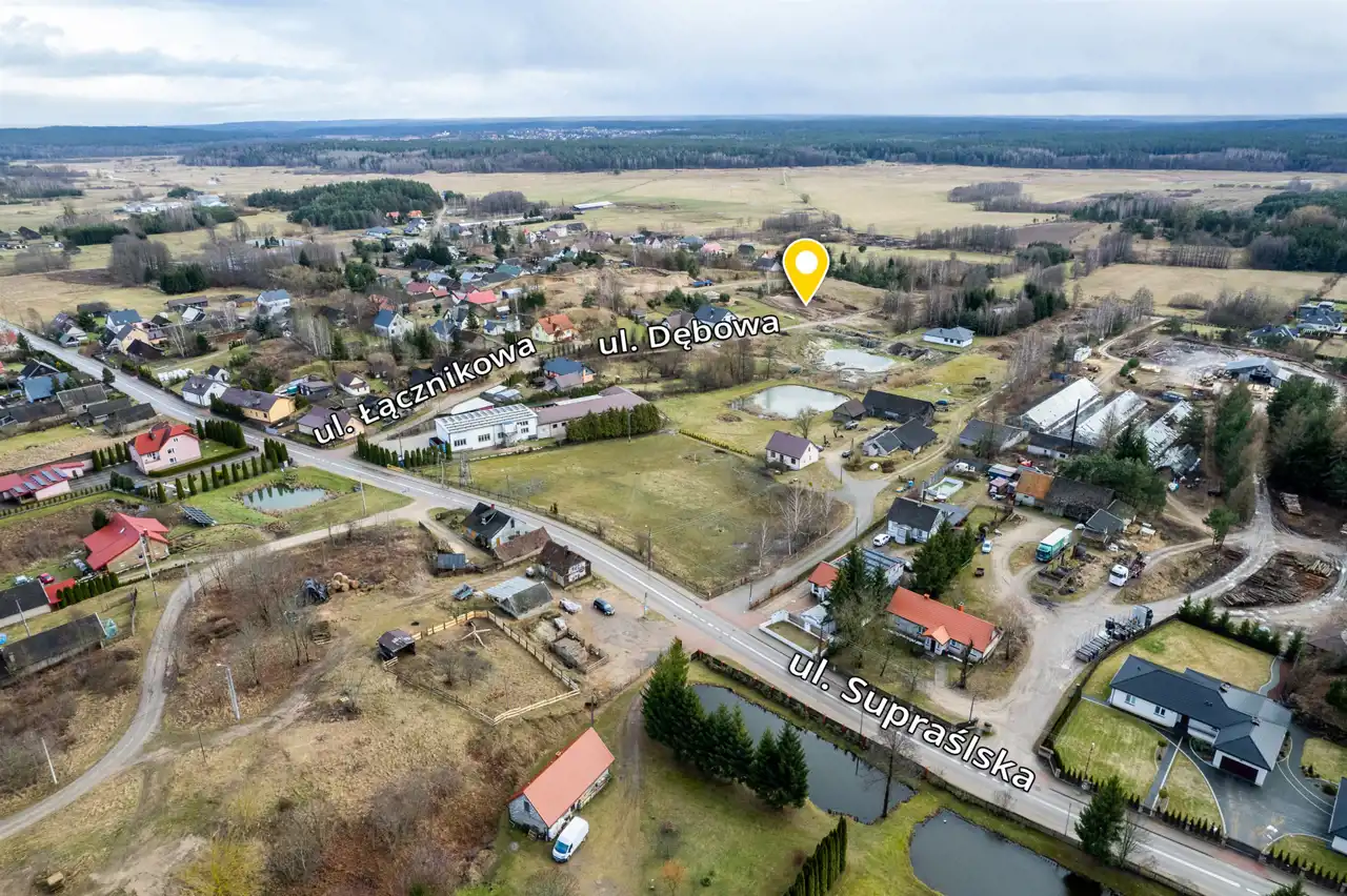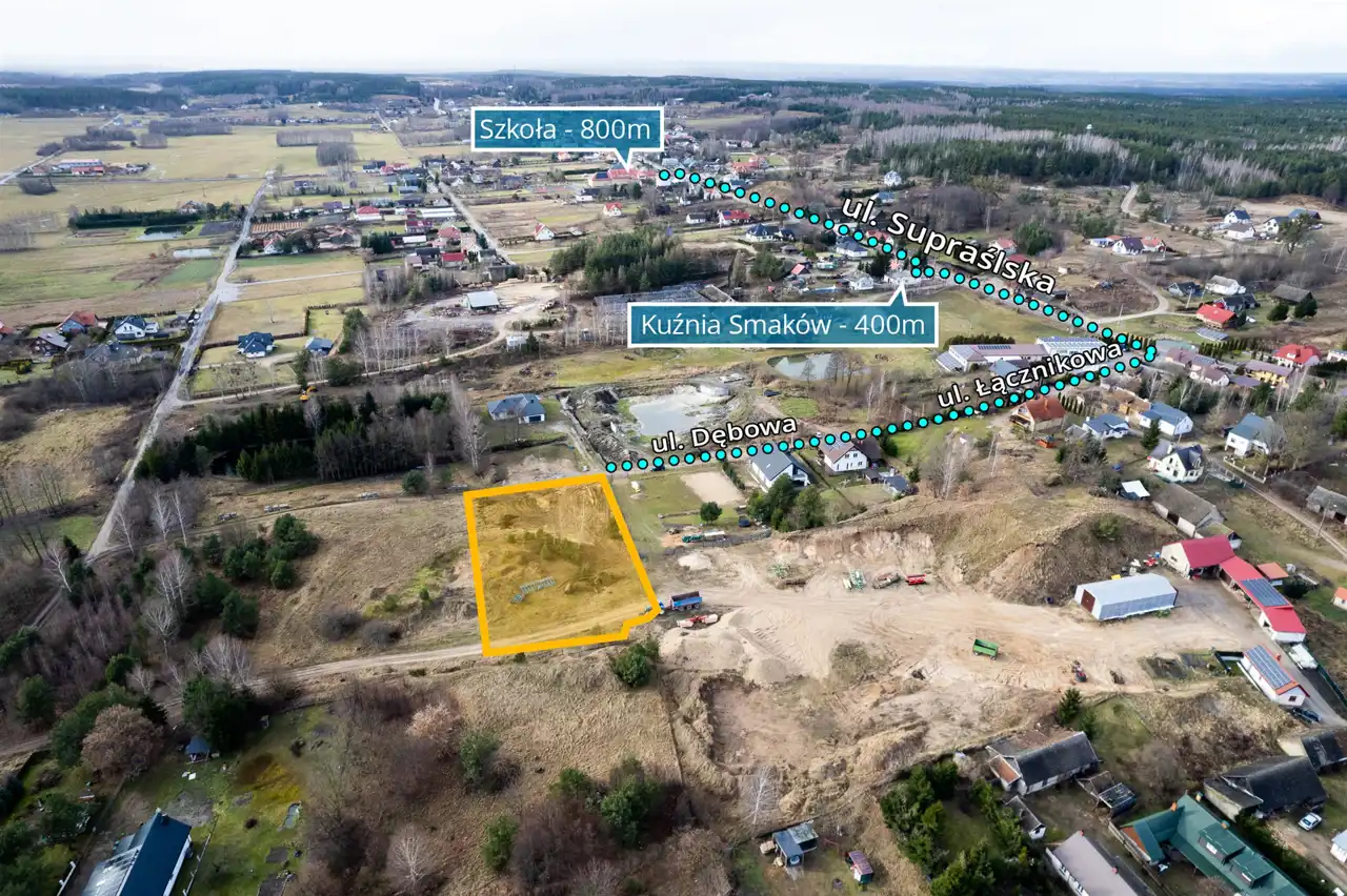 Działka dogodnie położona zaraz przy zjeździe z głównej drogi przy ul. Dębowej. W sąsiedztwie zabudowy jednorodzinne. W bliskiej odległości szkoła podstawowa, restauracja "Kuźnia Smaków".