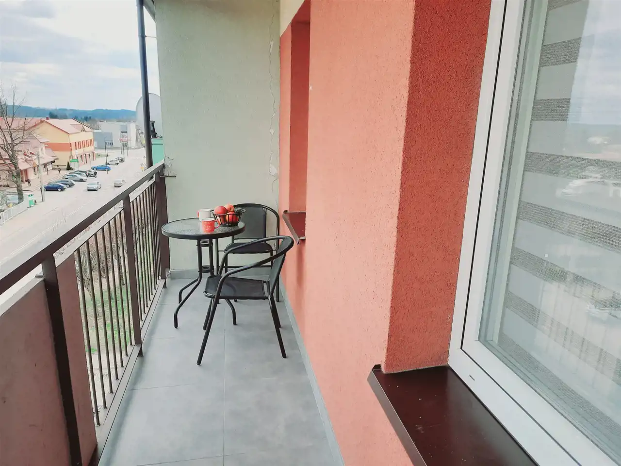 Duży, zabudowany balkon – przez całą długość salonu.