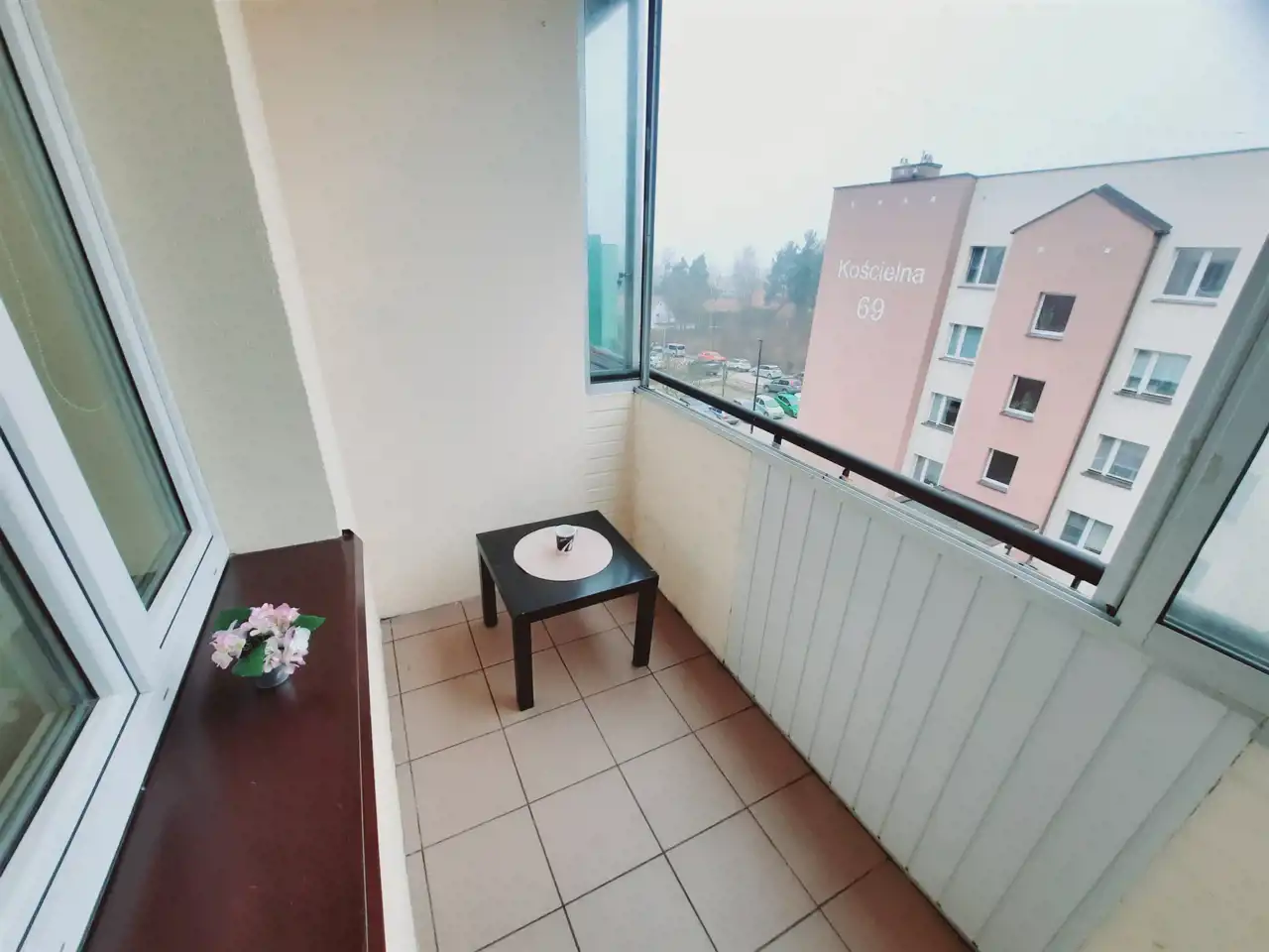 Duży, zabudowany balkon – przez całą długość salonu.
