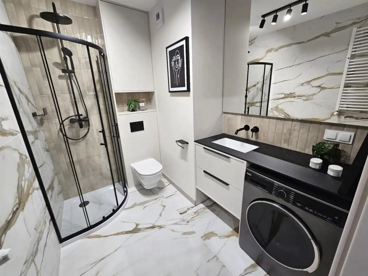 łazienka z prysznicem, WC, umywalką w zabudowie oraz pralką
